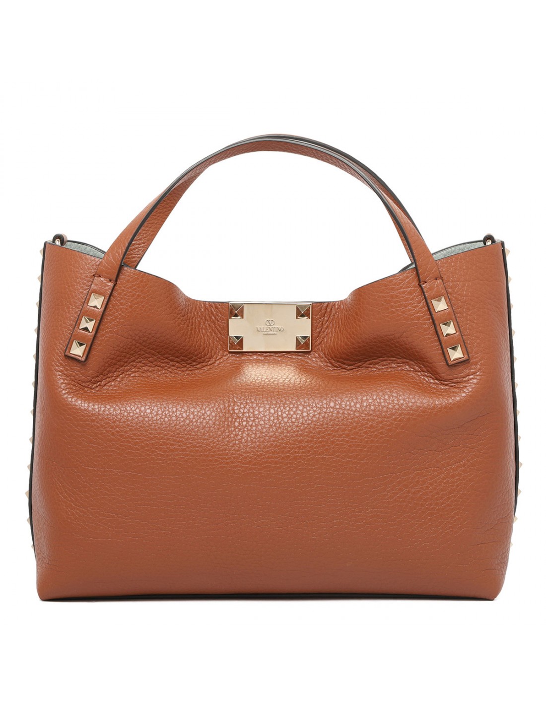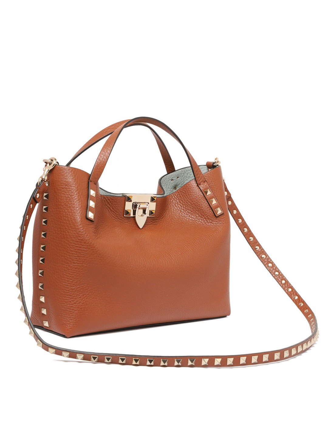 Tan hue grained leather Rockstud small bag from Valentino Garavani featuring contrasting sky gray lining, palladium-finish studs and hardware, hook closure, double top handle, detachable shoulder strap, internal detachable pouch.