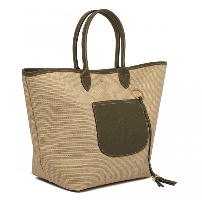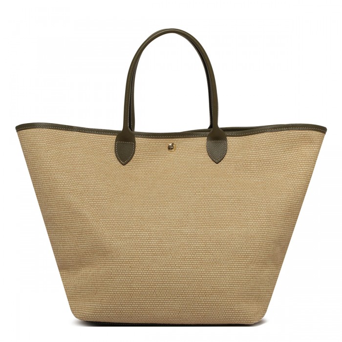 Natural canvas Le Pliage L basket bag from Longchamp featuring straw effect, dark green leather detail, embossed logo on outer flat pocket, key clip accessory, leather top handles, snap button closure, one internal zipped pocket.