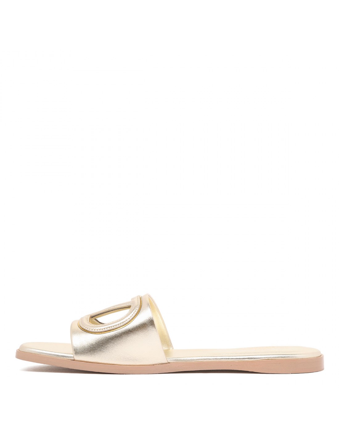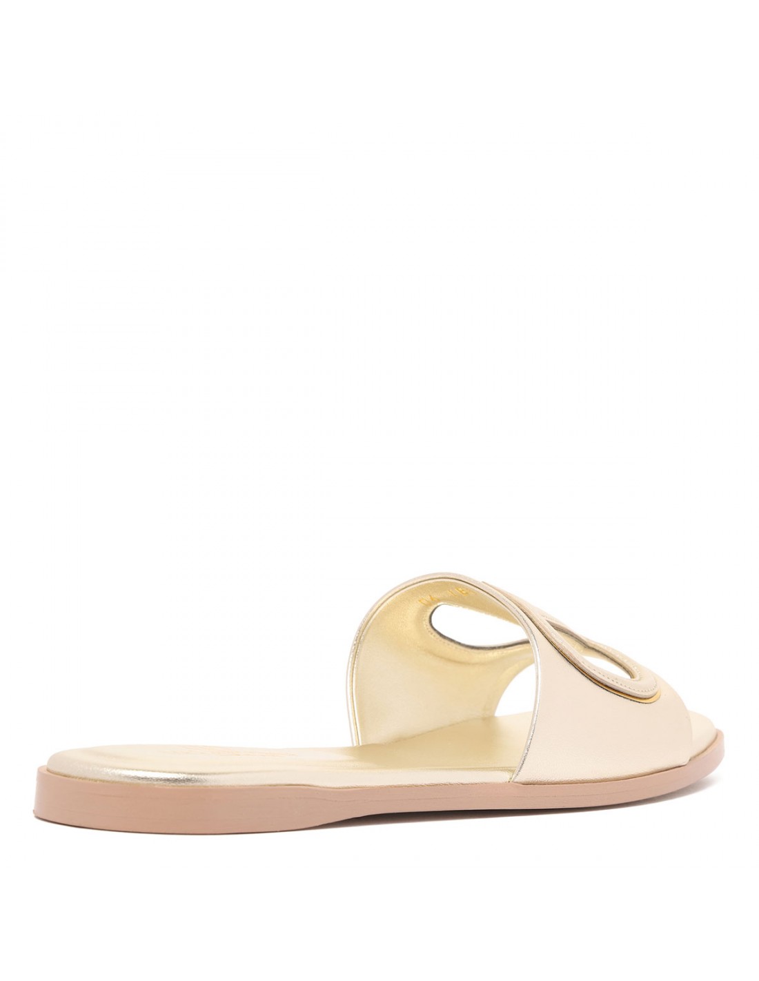 Platinum and brass metallic leather VLogo Signature slide sandals from Valentino Garavani featuring VLogo cut out, square open toe, flat heel, leather sole.