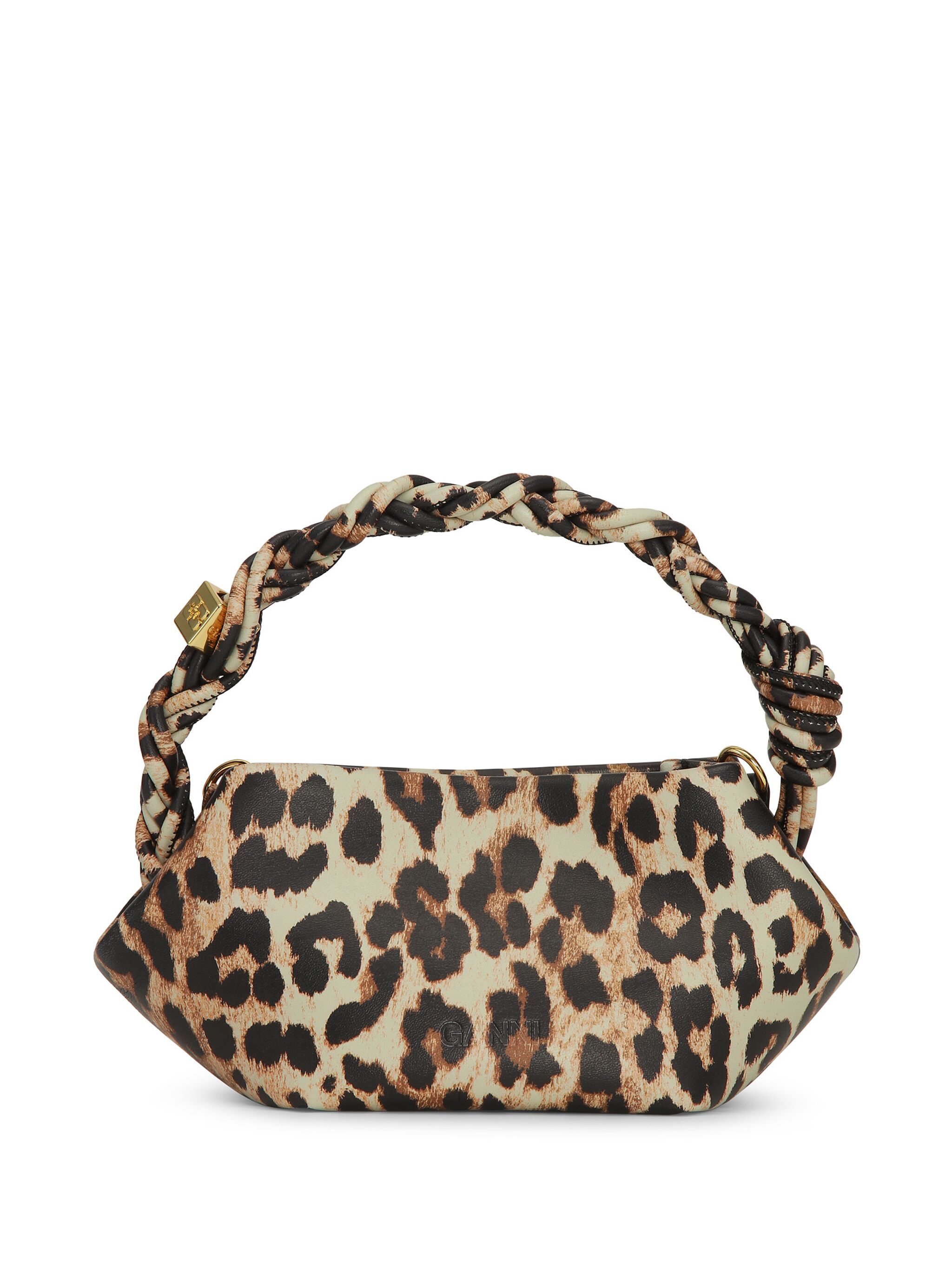 brown recycled leather blend allover leopard print single braided top handle adjustable detachable shoulder strap goldtone logo plaque main compartment