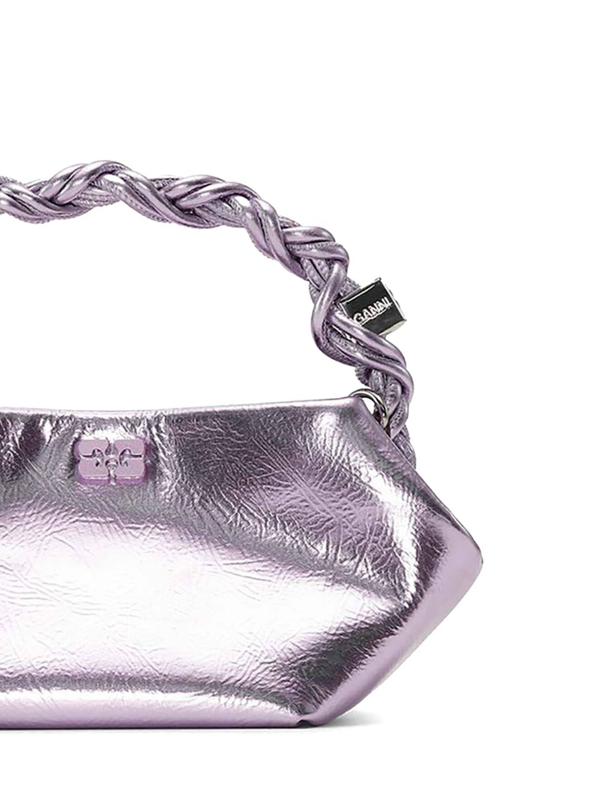 lavender purple recycled leather blend grained texture metallic effect concealed magnetic fastening single braided top handle adjustable detachable shoulder strap logo plaque applique logo debossed logo to the rear partitioned compartment