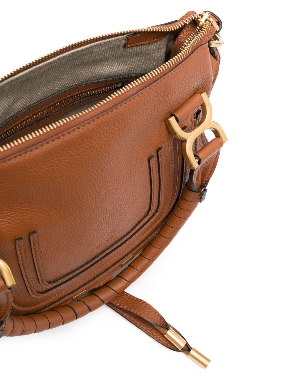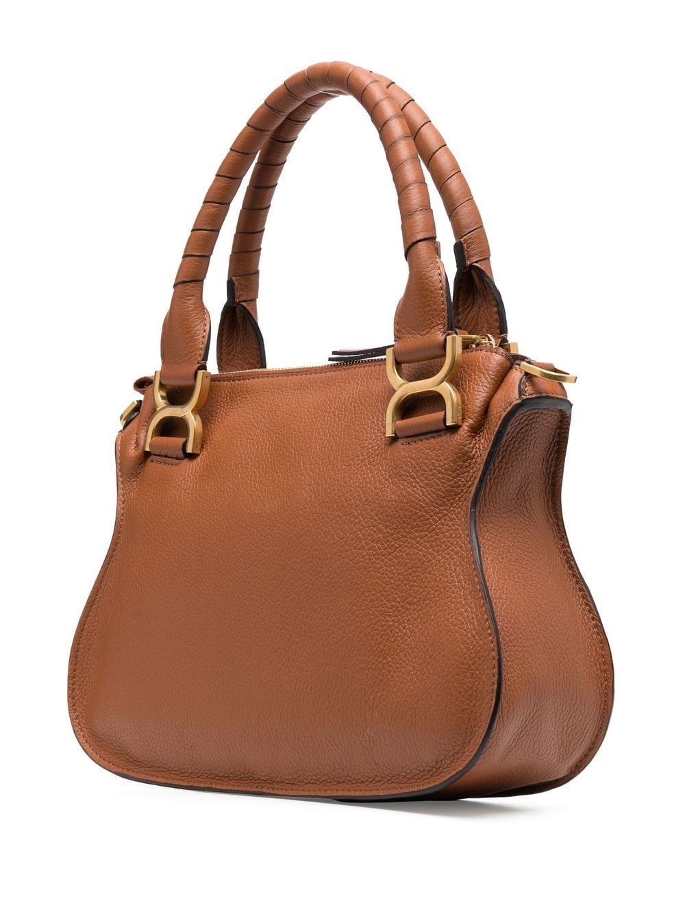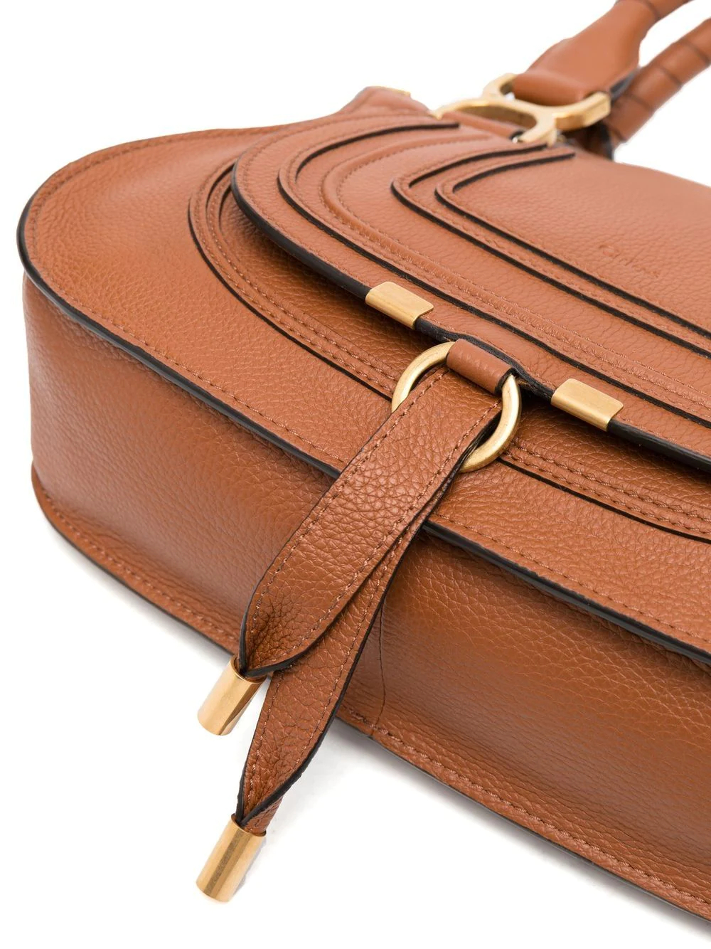 Crafted from calfskin this small Marcie bag features a soft silhouette with feminine lines The style is finished with saddle stitching iconic goldtone buckles and double handwrapped handles The lines leather tassels secure the flap