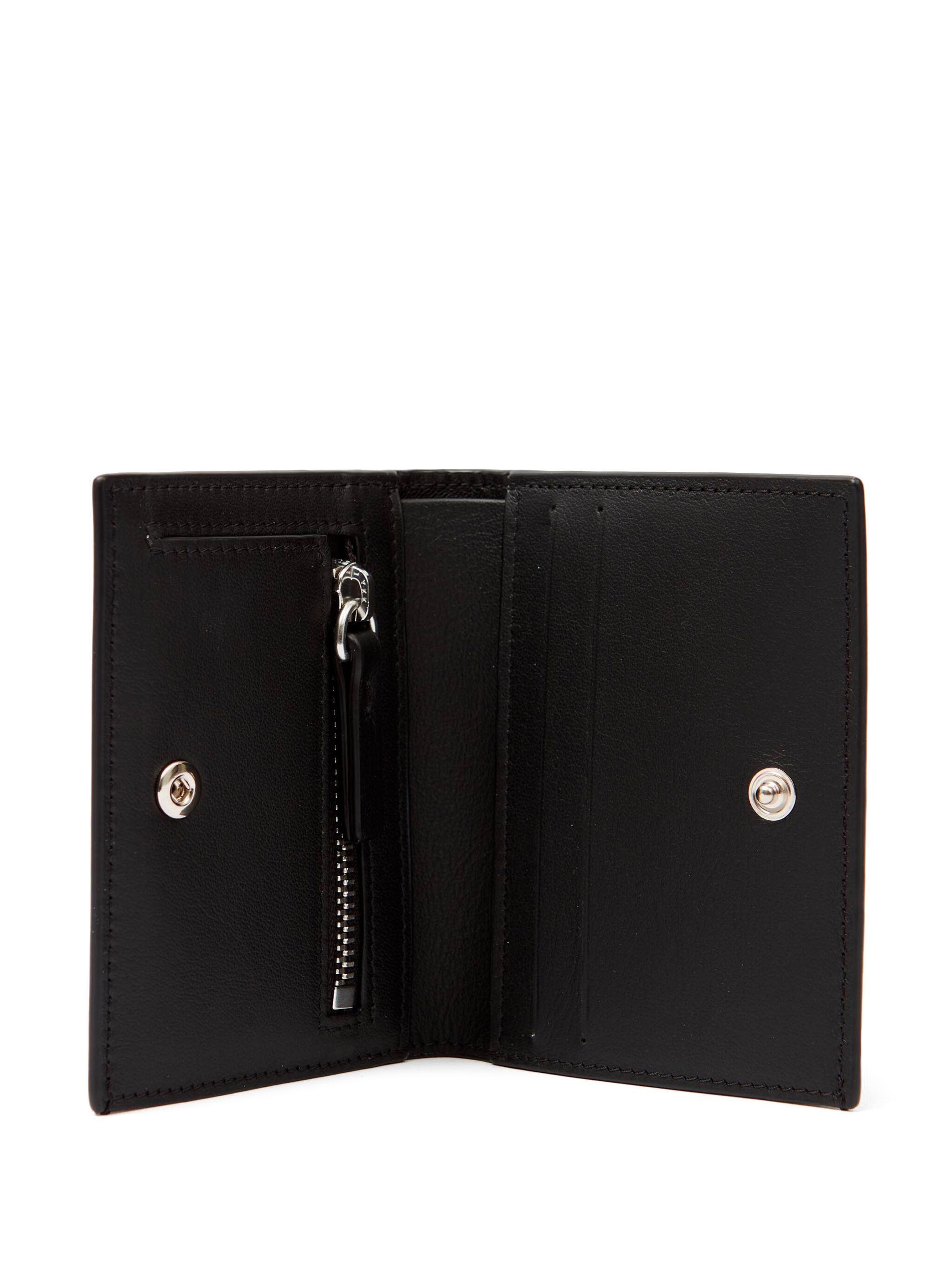 Black calf leather smooth grain concealed pressstud fastening bifold design logo plaque signature numbers motif signature singlestitch logo internal zipfastening pocket card slots