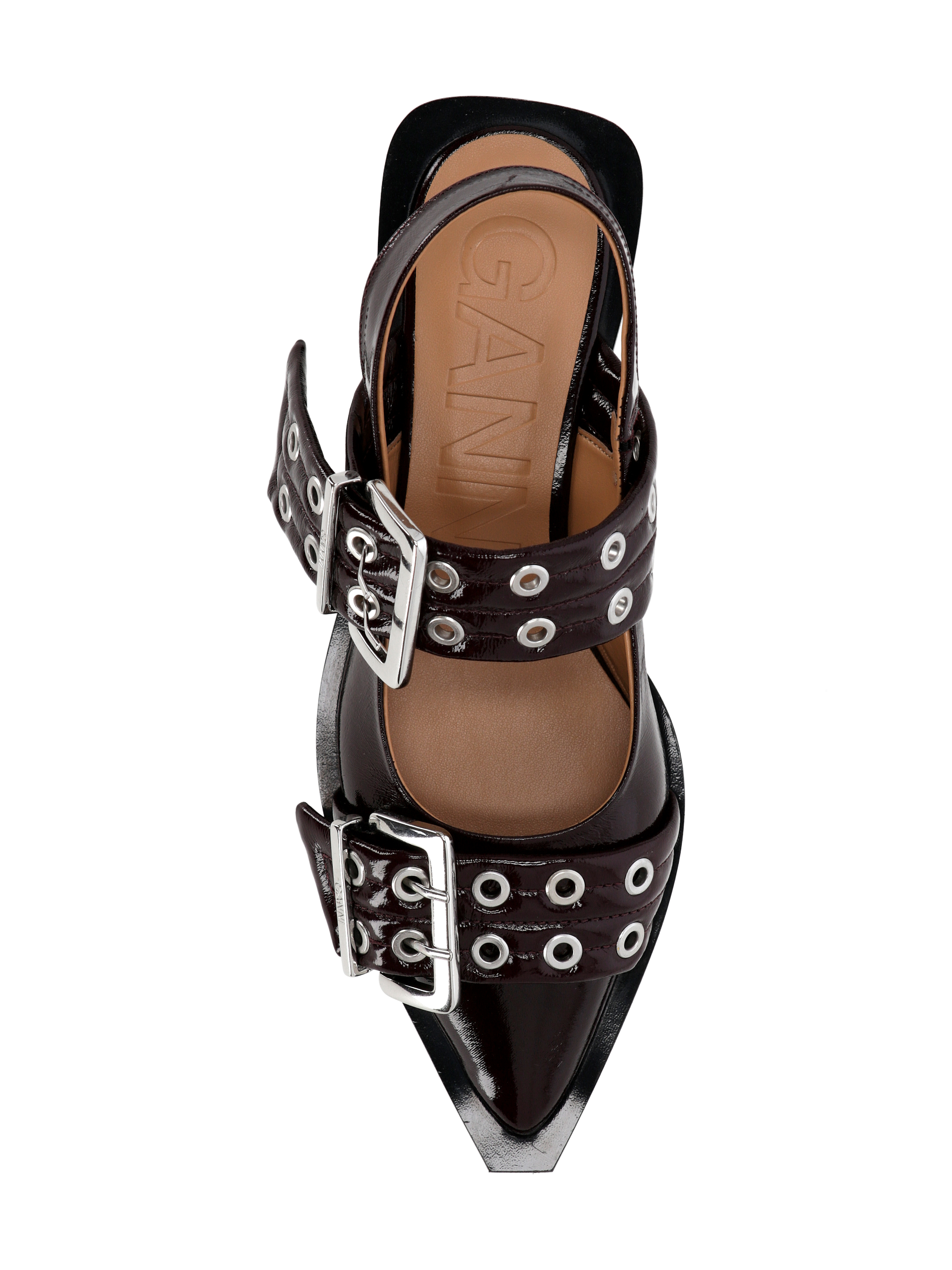Burgundy Feminine Buckle Ballerinas feature slingback straps and a pointed toe The shoes have two silvertone buckles with matching eyelets and a black squared block heel