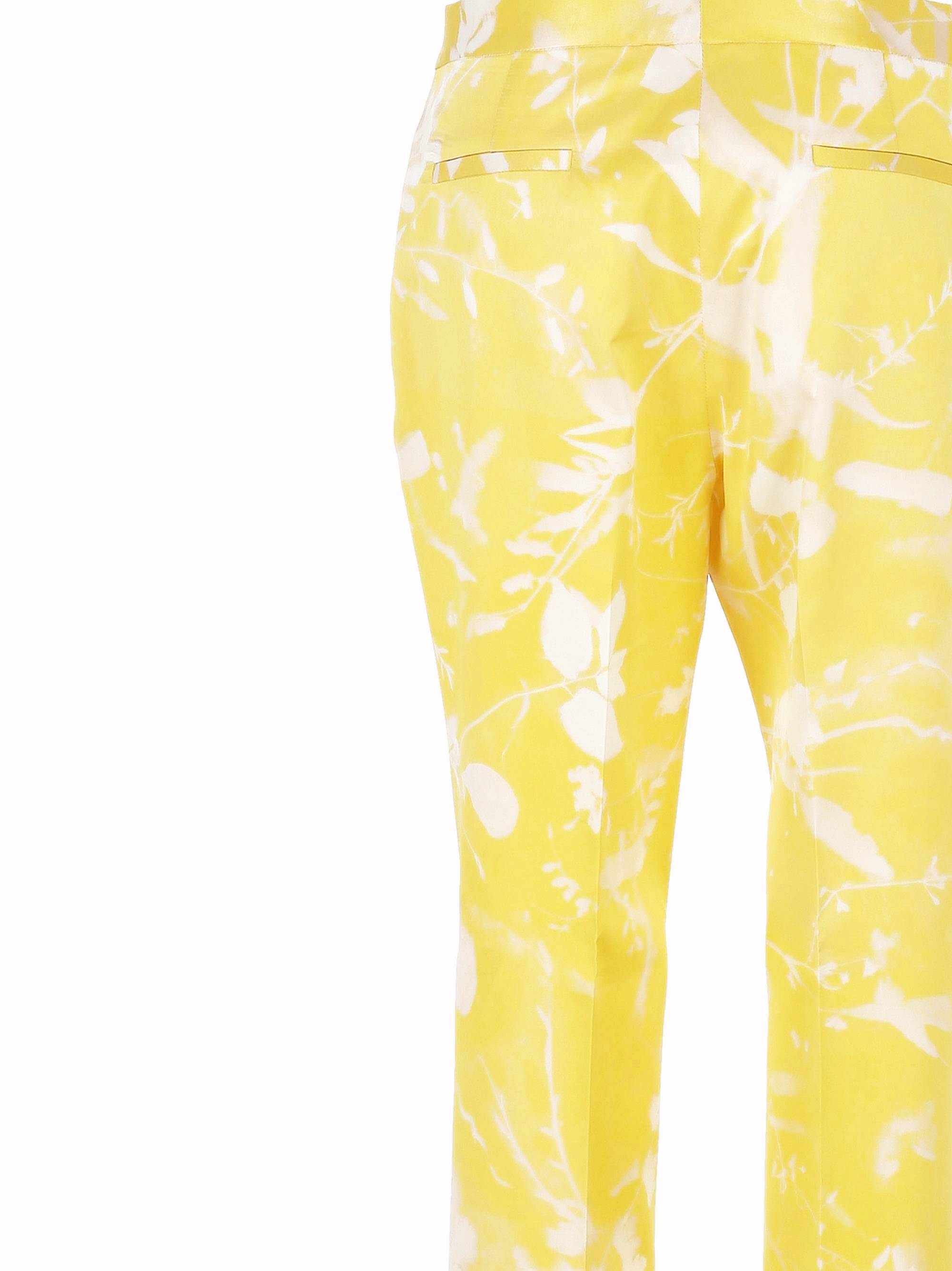 jasmine yellow concealed front button hook and zip fastening two side slit pockets two rear jetted pockets leaf print
