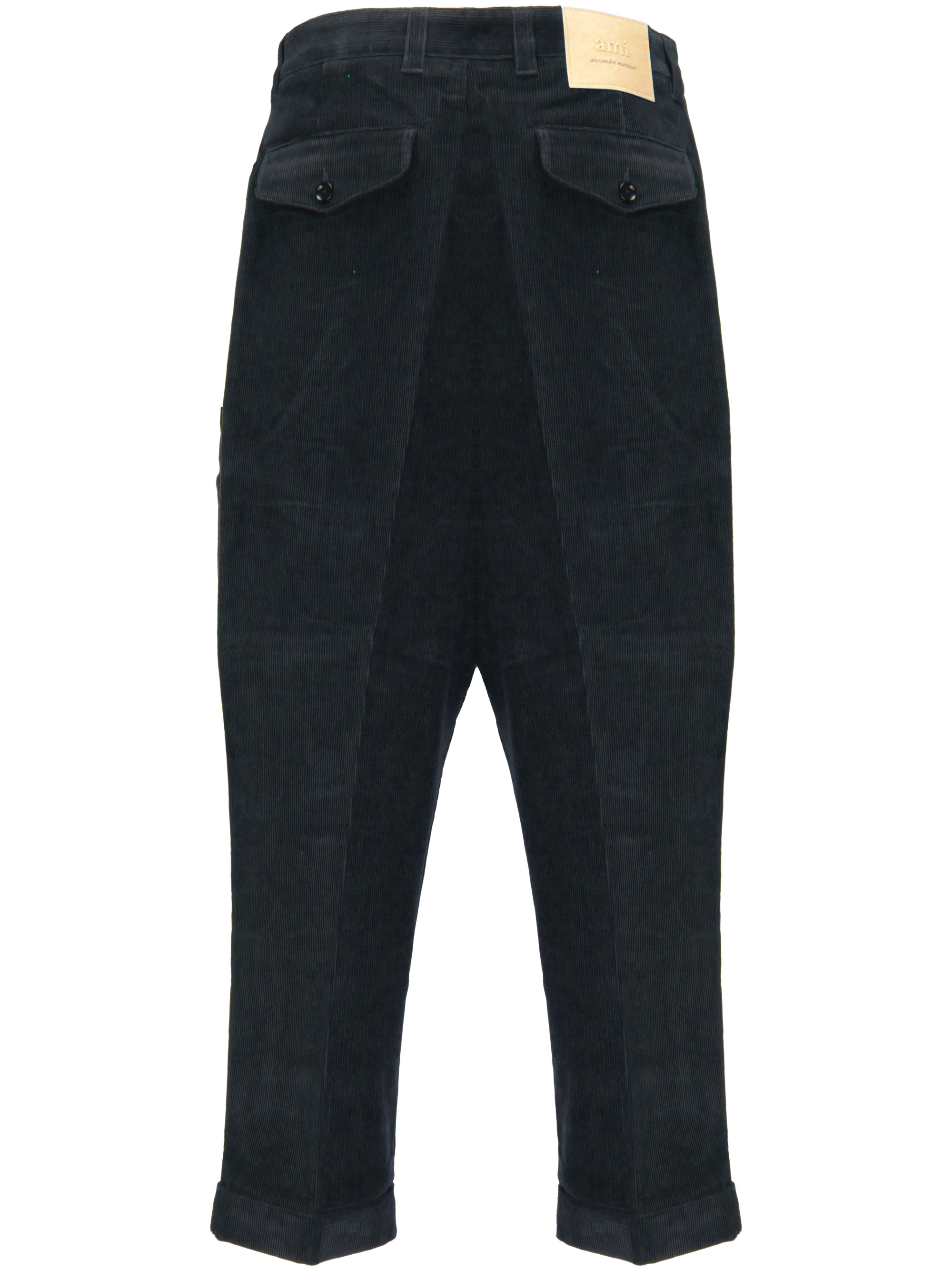 navy blue wool corduroy logo patch to the rear midrise belt loops pleat detailing front button and zip fastening tapered leg cropped leg slip pockets to the sides two rear flap pockets