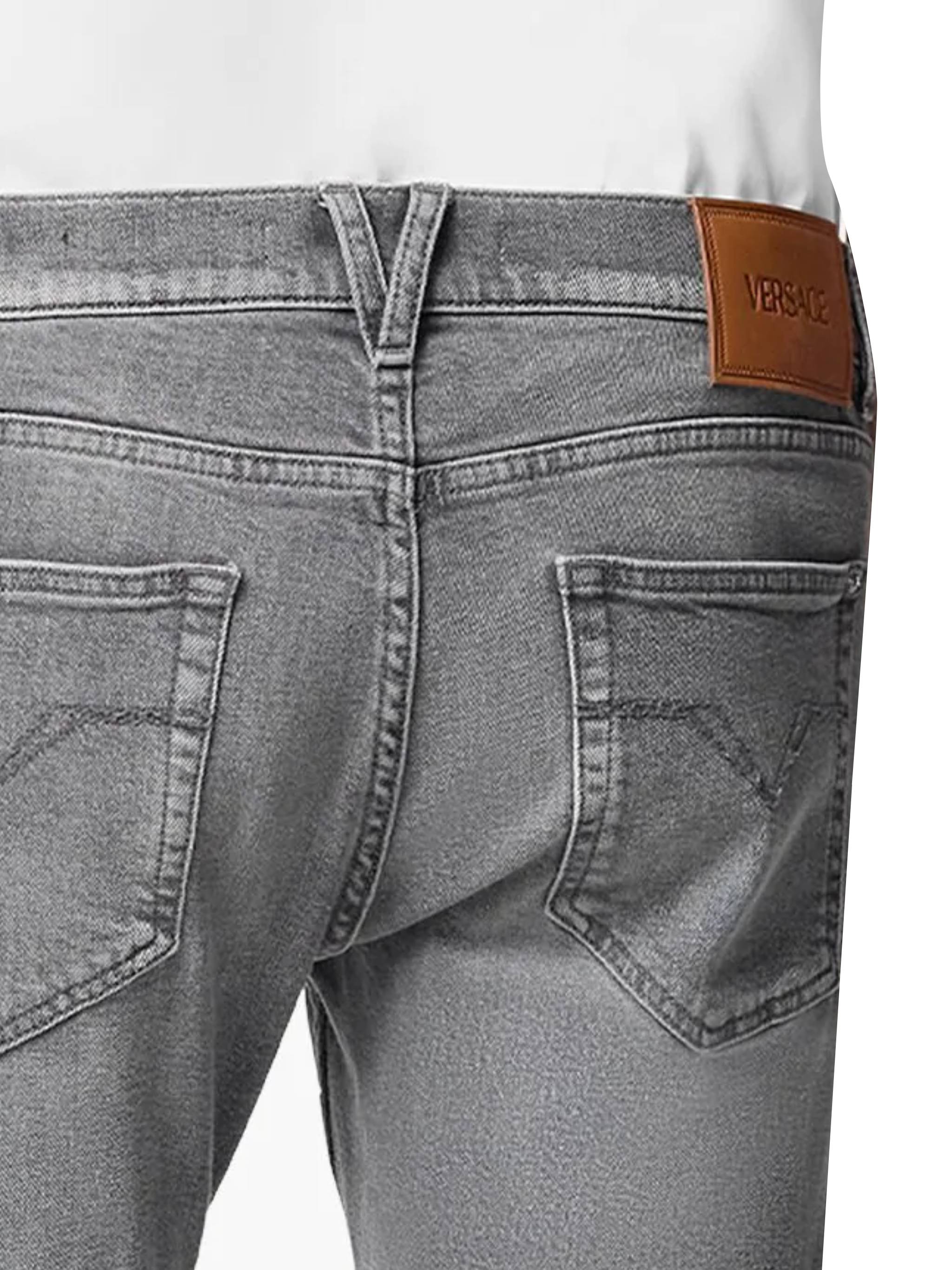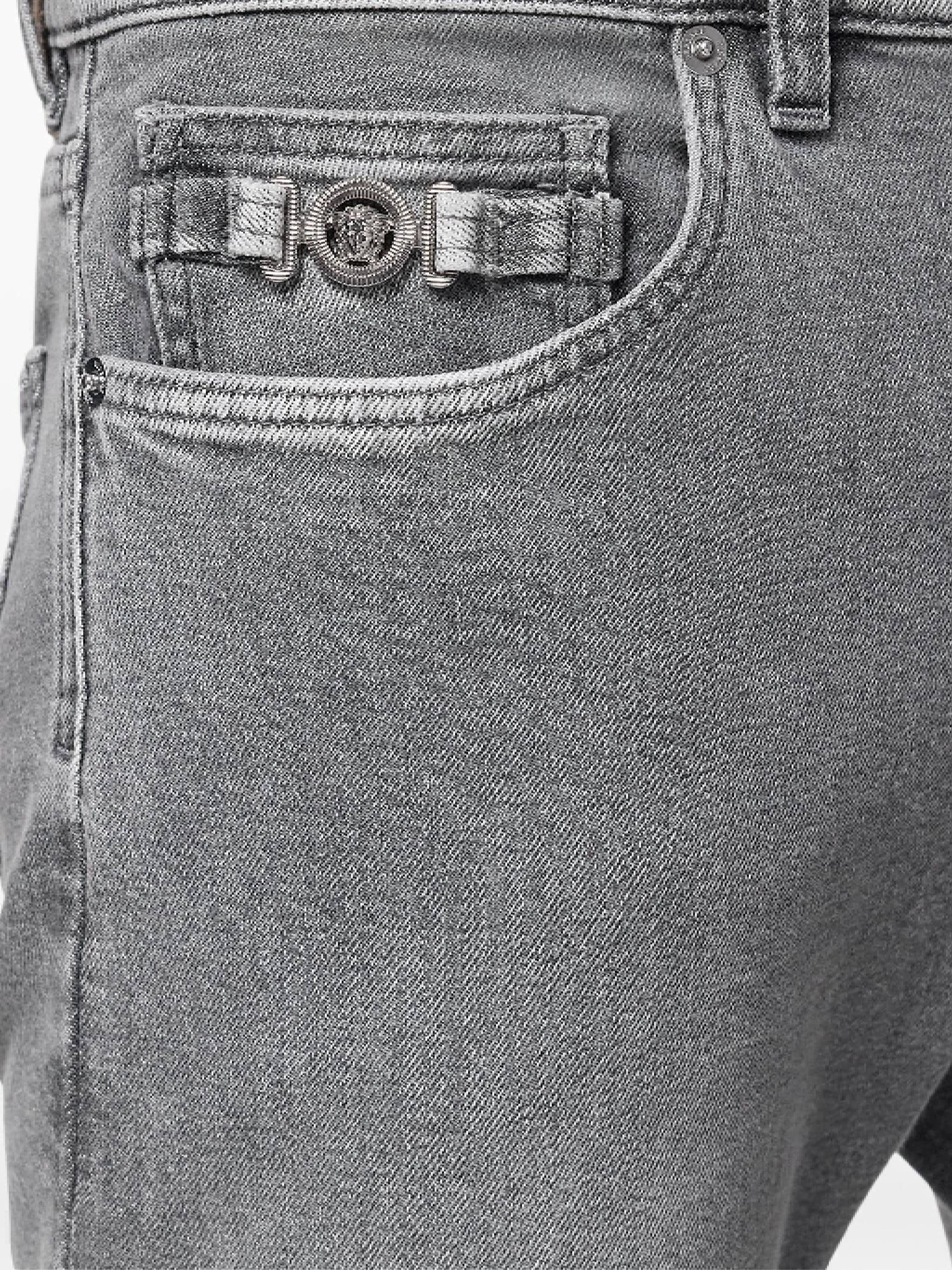 grey cotton lowrise Medusa Head motif logo patch to the rear belt loops slim cut classic five pockets