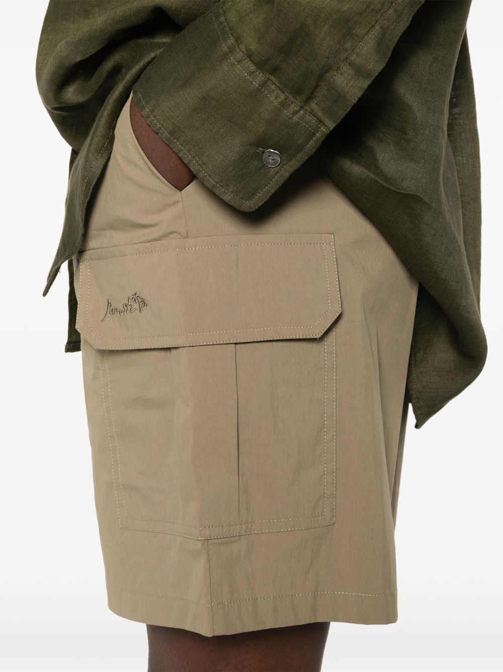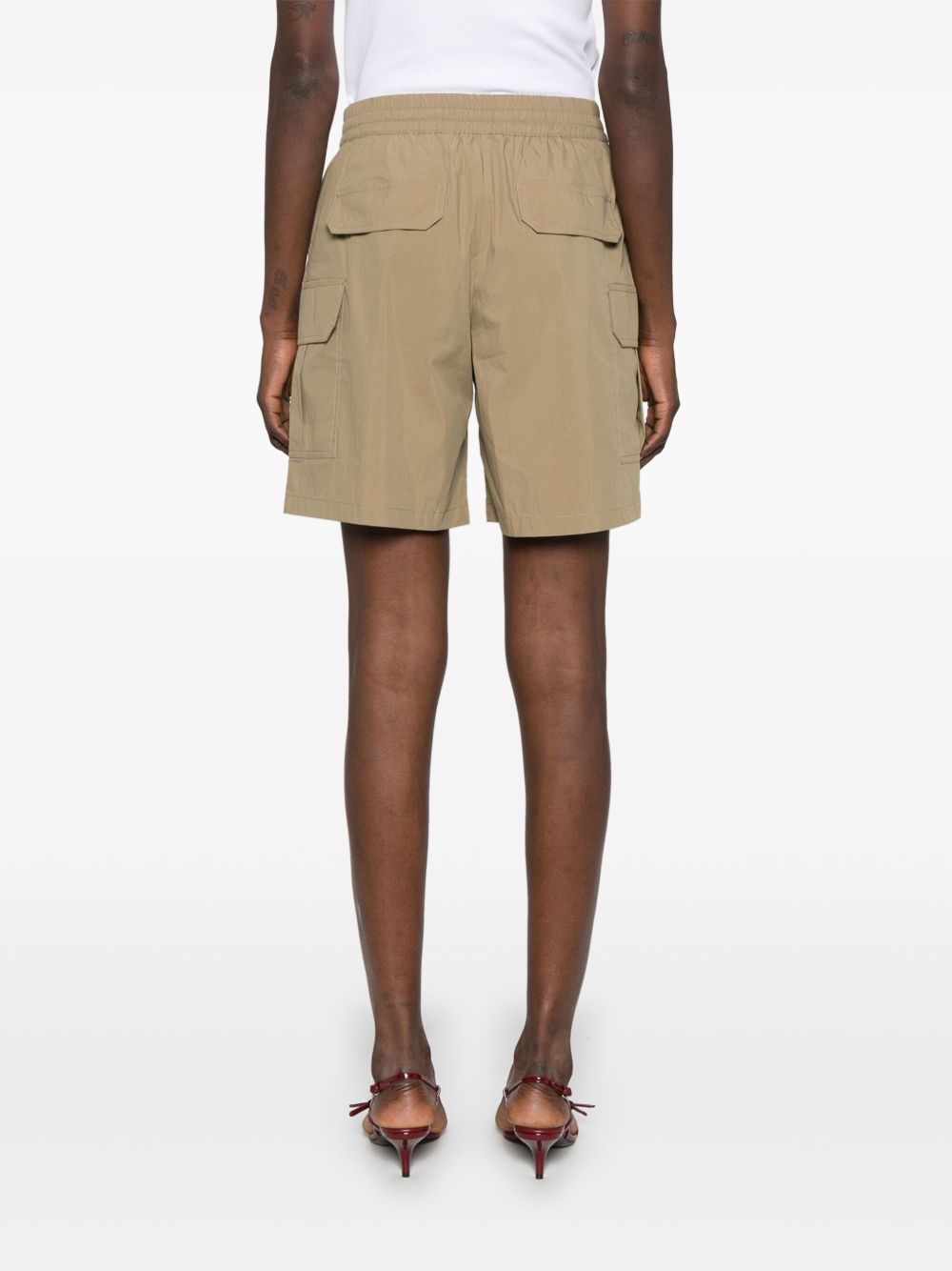 sesame beige elasticated drawstring waistband two diagonal pockets to the sides two side cargo pockets two rear flap pockets