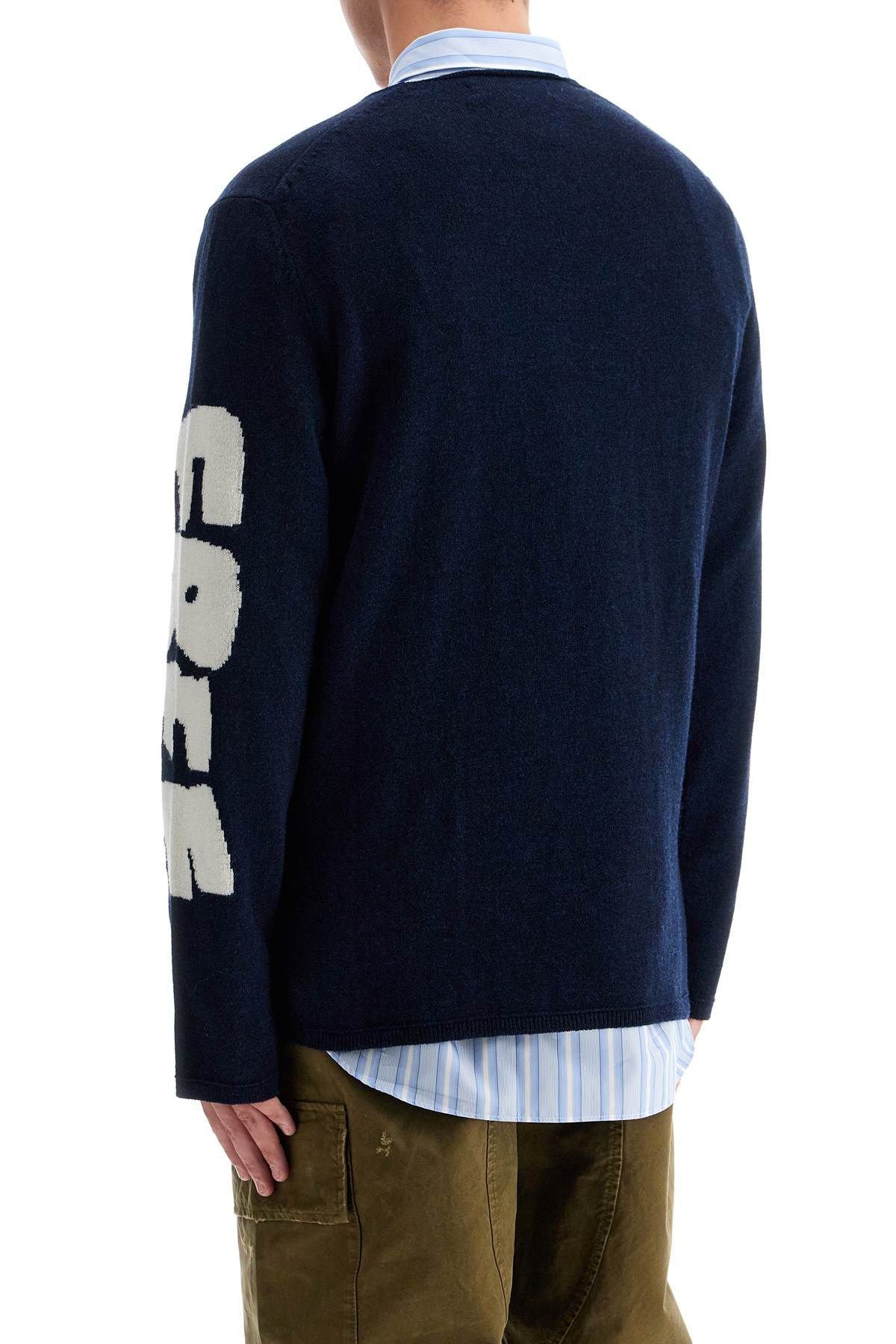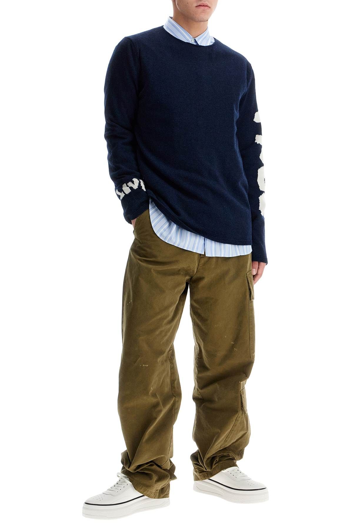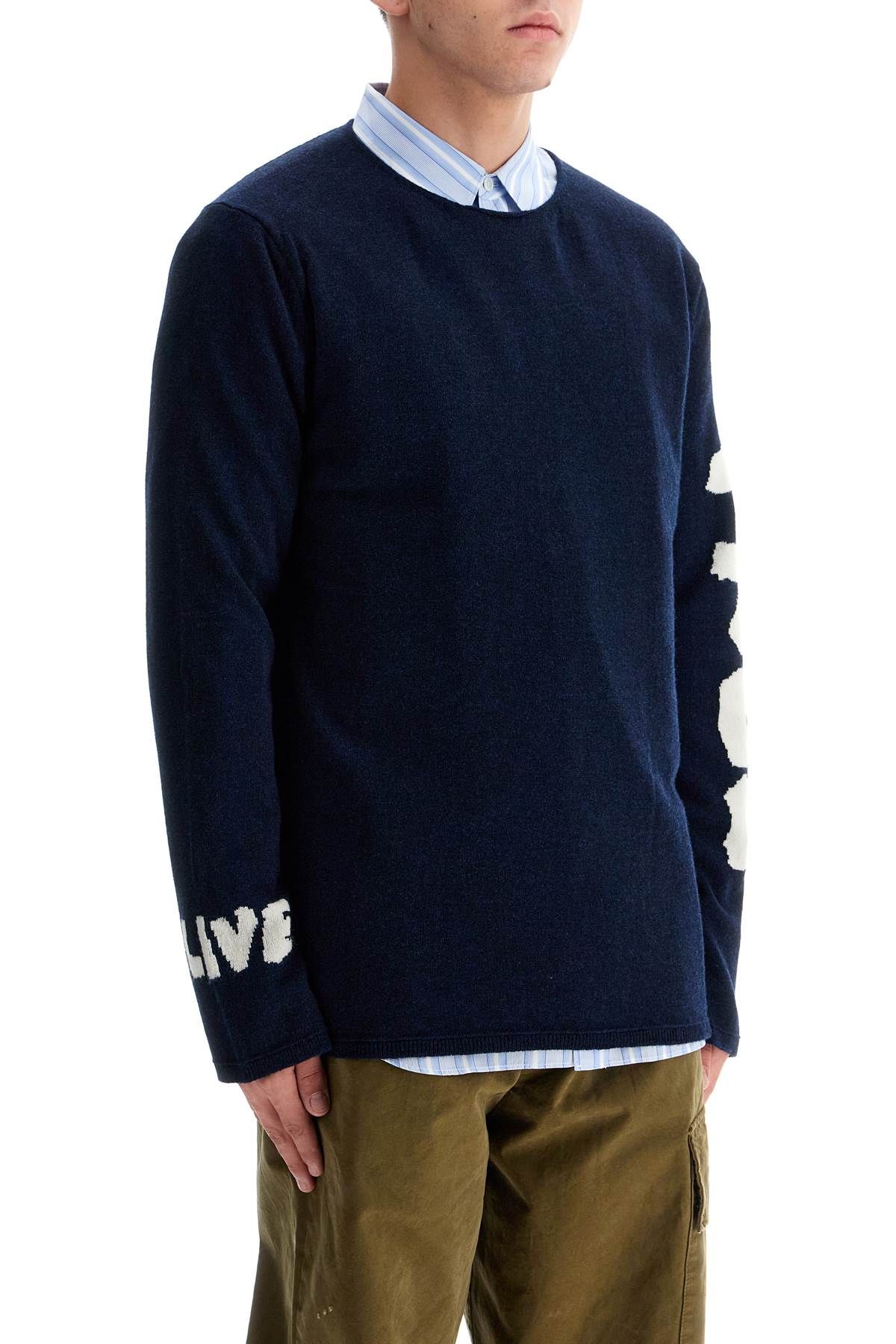 This Comme Des Garçons SHIRT pullover is made of wool knit with a relaxed fit and contrasting jacquard lettering on the sleeves