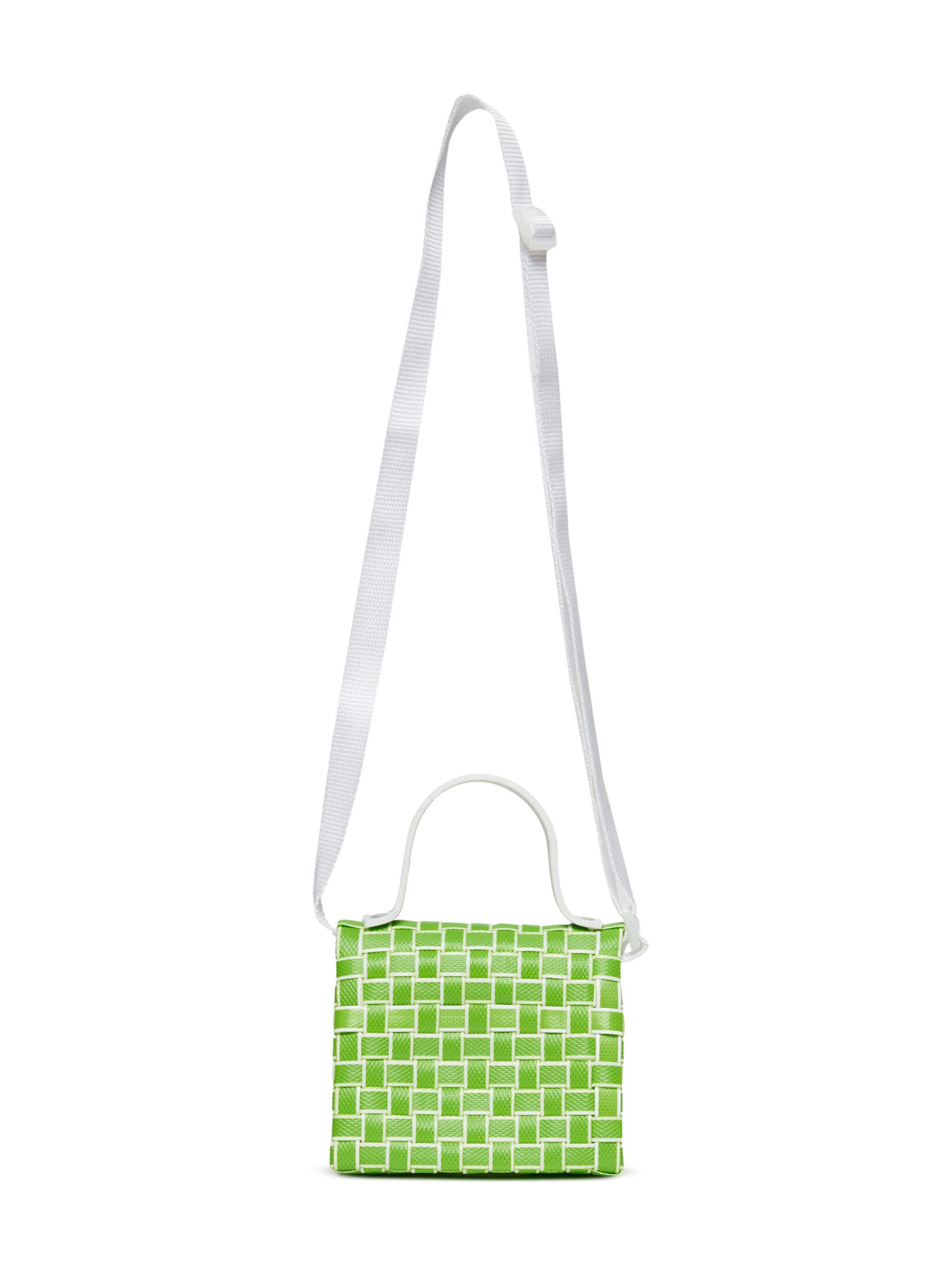 lime greenwhite interwoven design foldover top with magnetic fastening single top handle adjustable shoulder strap applique logo main compartment unlined