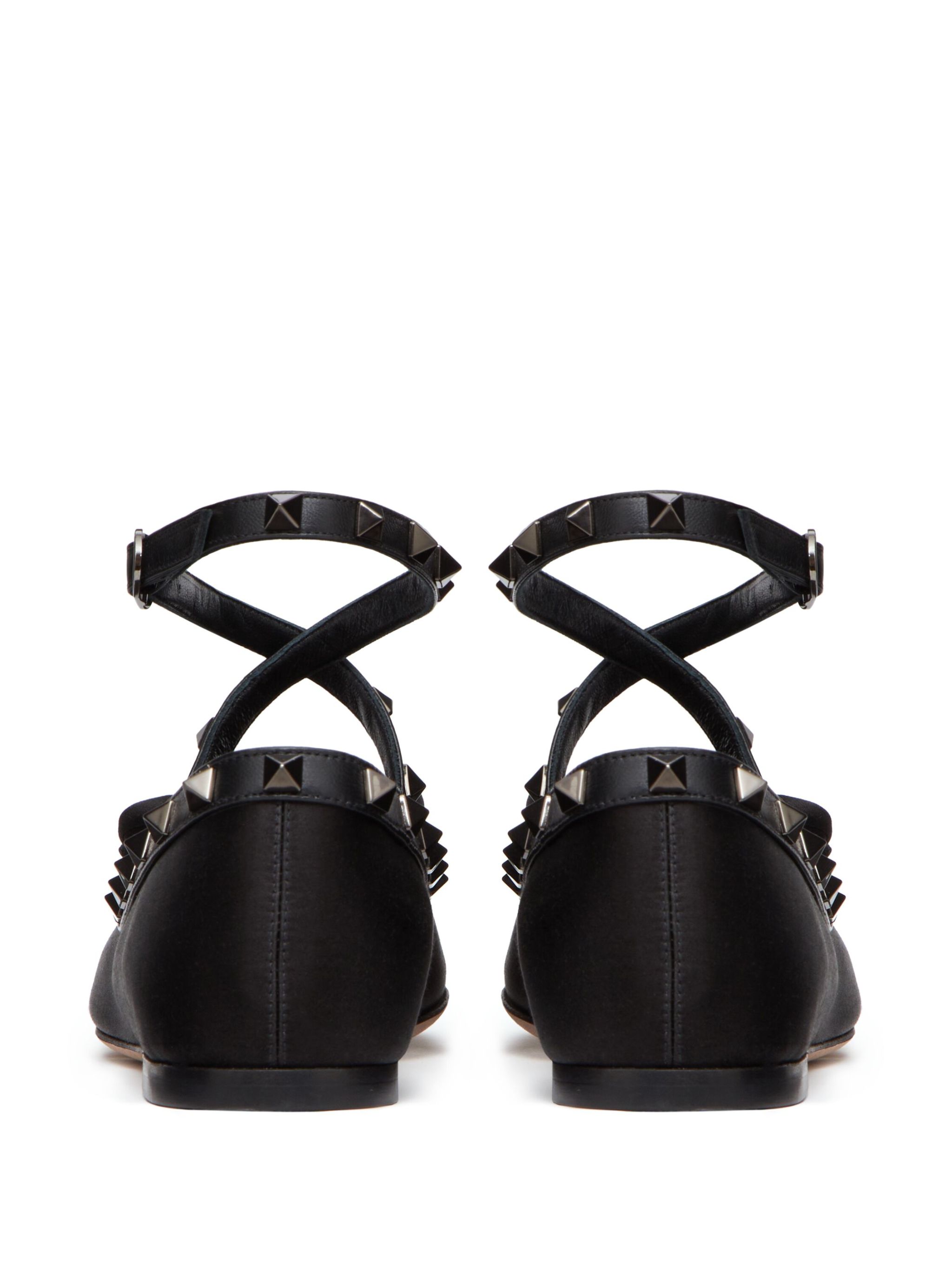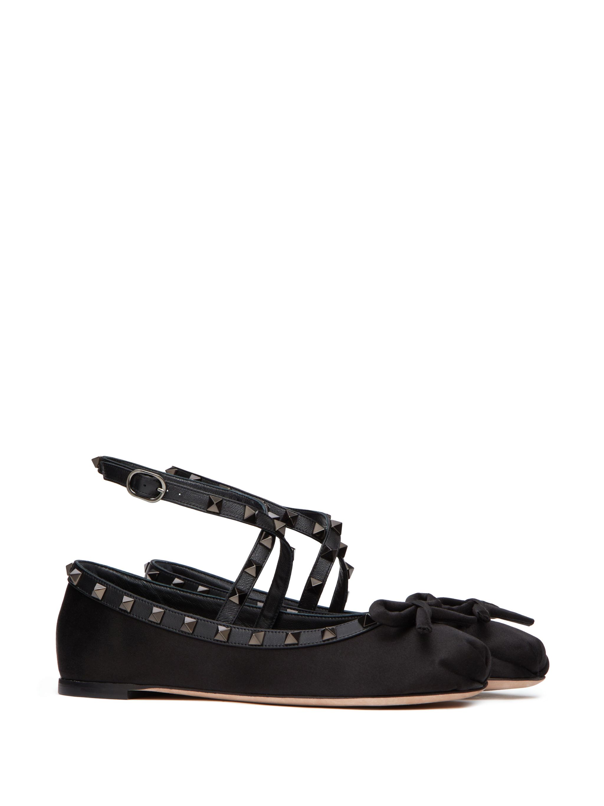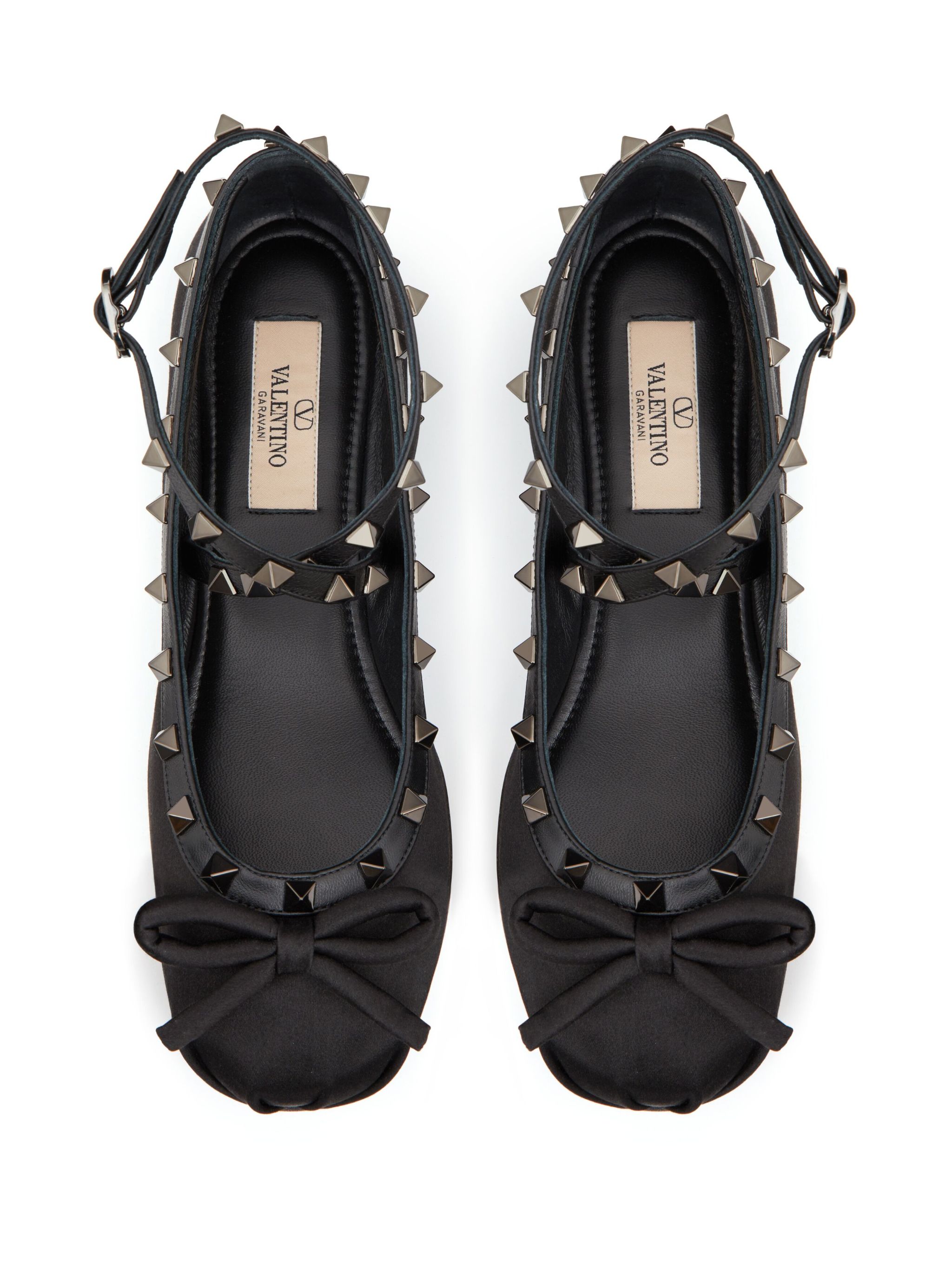 black calf leather satin finish tonal signature Rockstud embellishment bow detailing bucklefastening crossover ankle strap branded footbed round toe flat sole