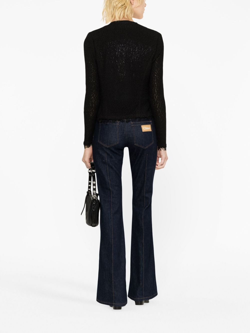 black cotton blend textured finish fringe detailing round neck open front long sleeves two side welt pockets