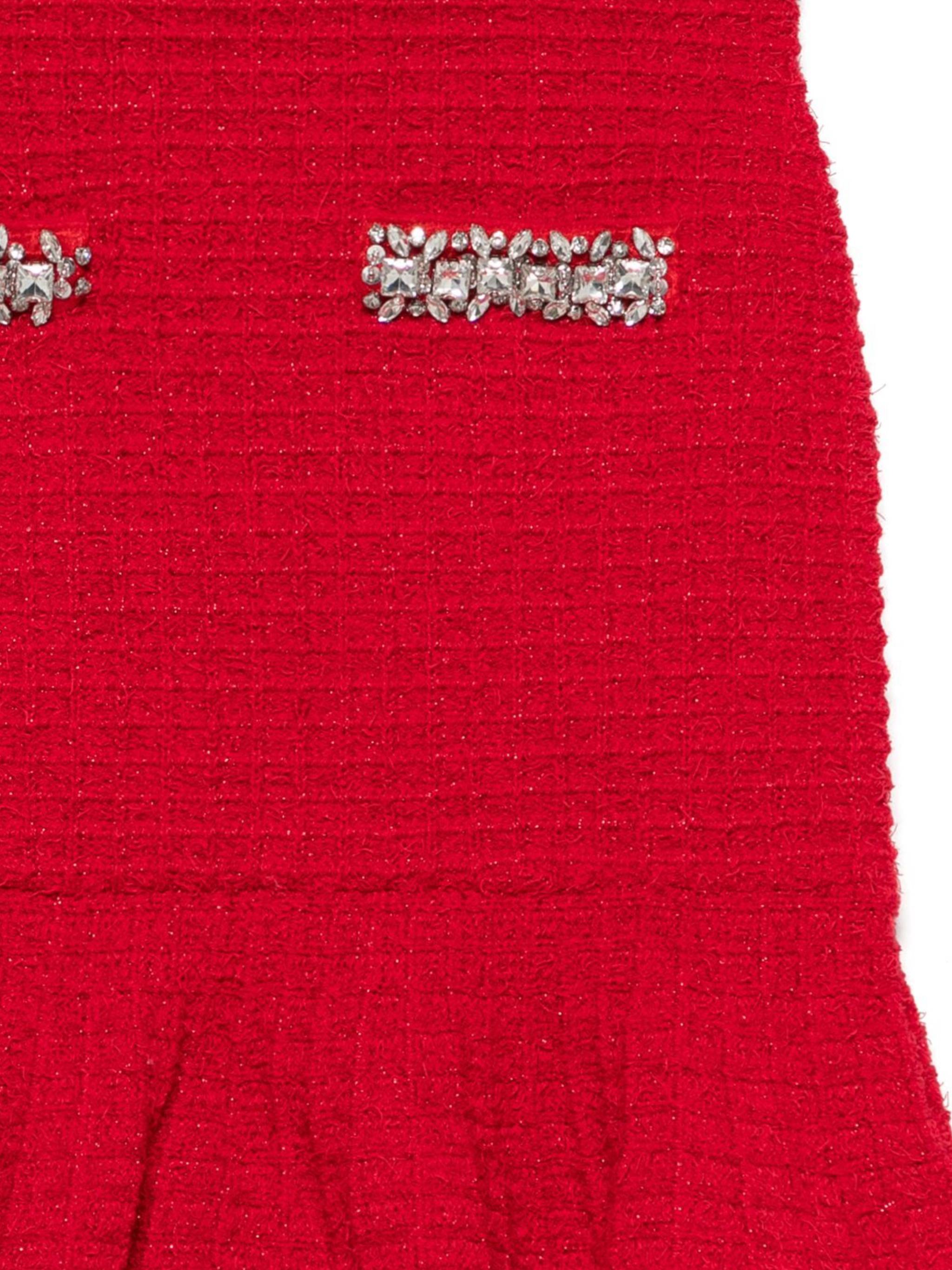 Cardinal red elasticated waistband two front welt pockets ruffle hem crystal embellishment