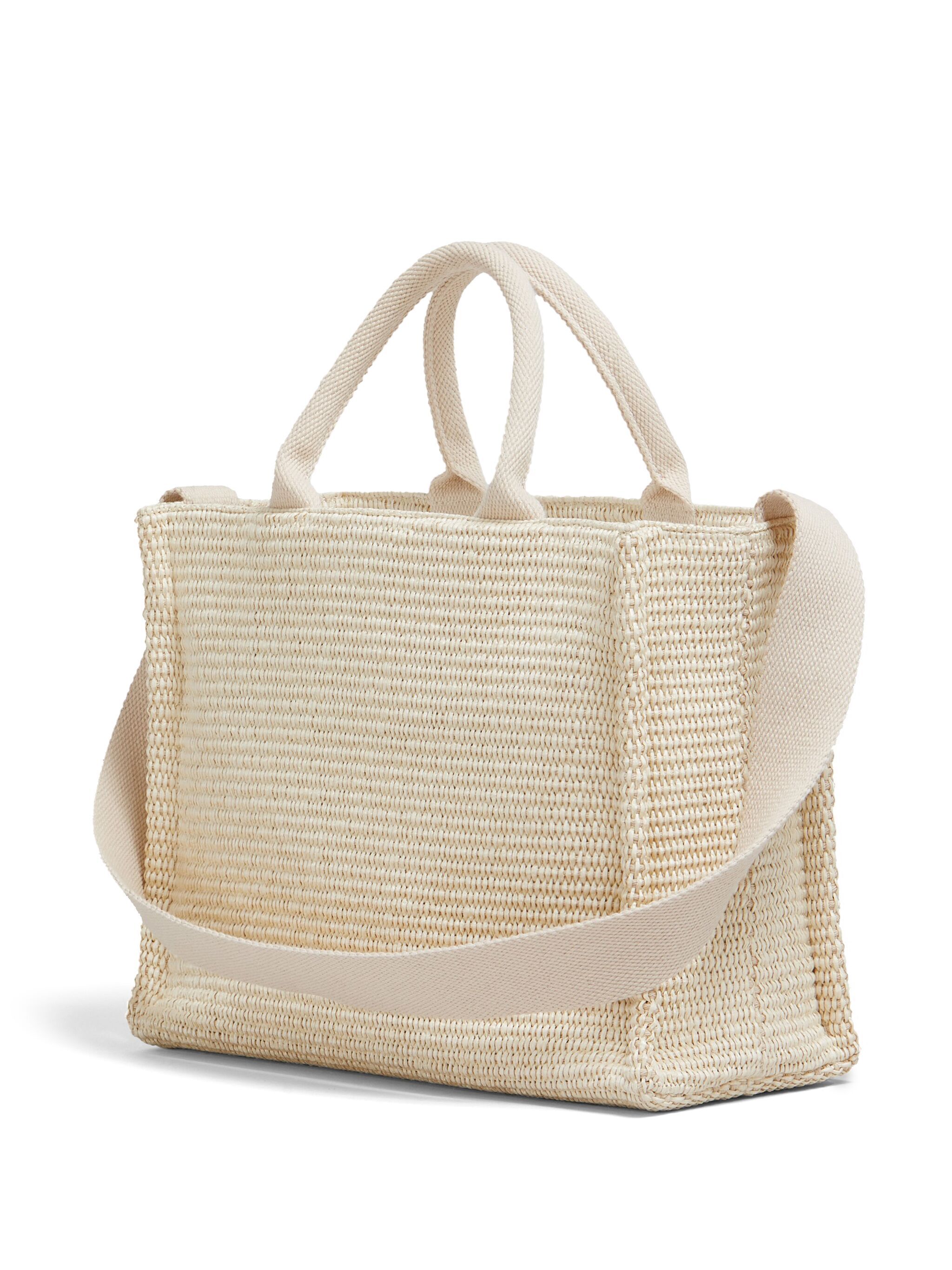 Small EastWest tote bag in woven raffia By hand and on the shoulder Two cotton ribbon handles and long shoulder strap Fabric lining with zip pocket Palladiumcolored metal elements Marni logo embroidered on the front