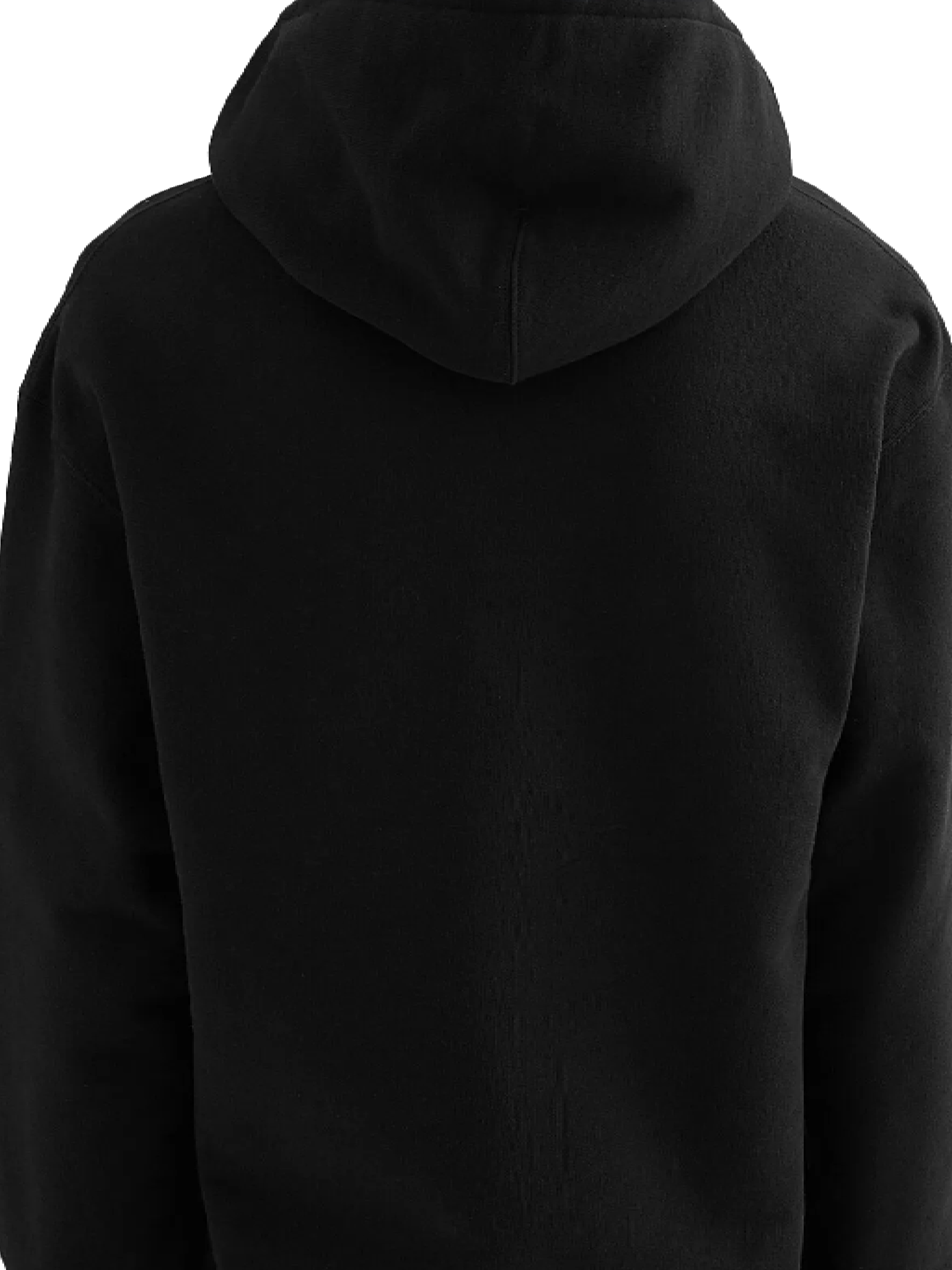 black cotton jersey texture drawstring hood drop shoulder long sleeves logo print to the front ribbed cuffs and hem