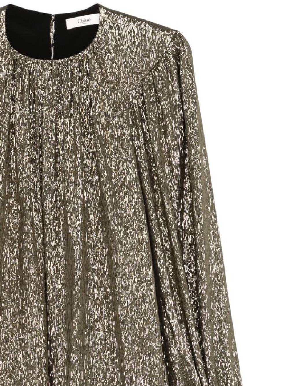 Fluid gathered mini dress with round neckline in lame blend silk crepon characterized by fabriccovered buttons and dangling laces finished with goldtone metal ends