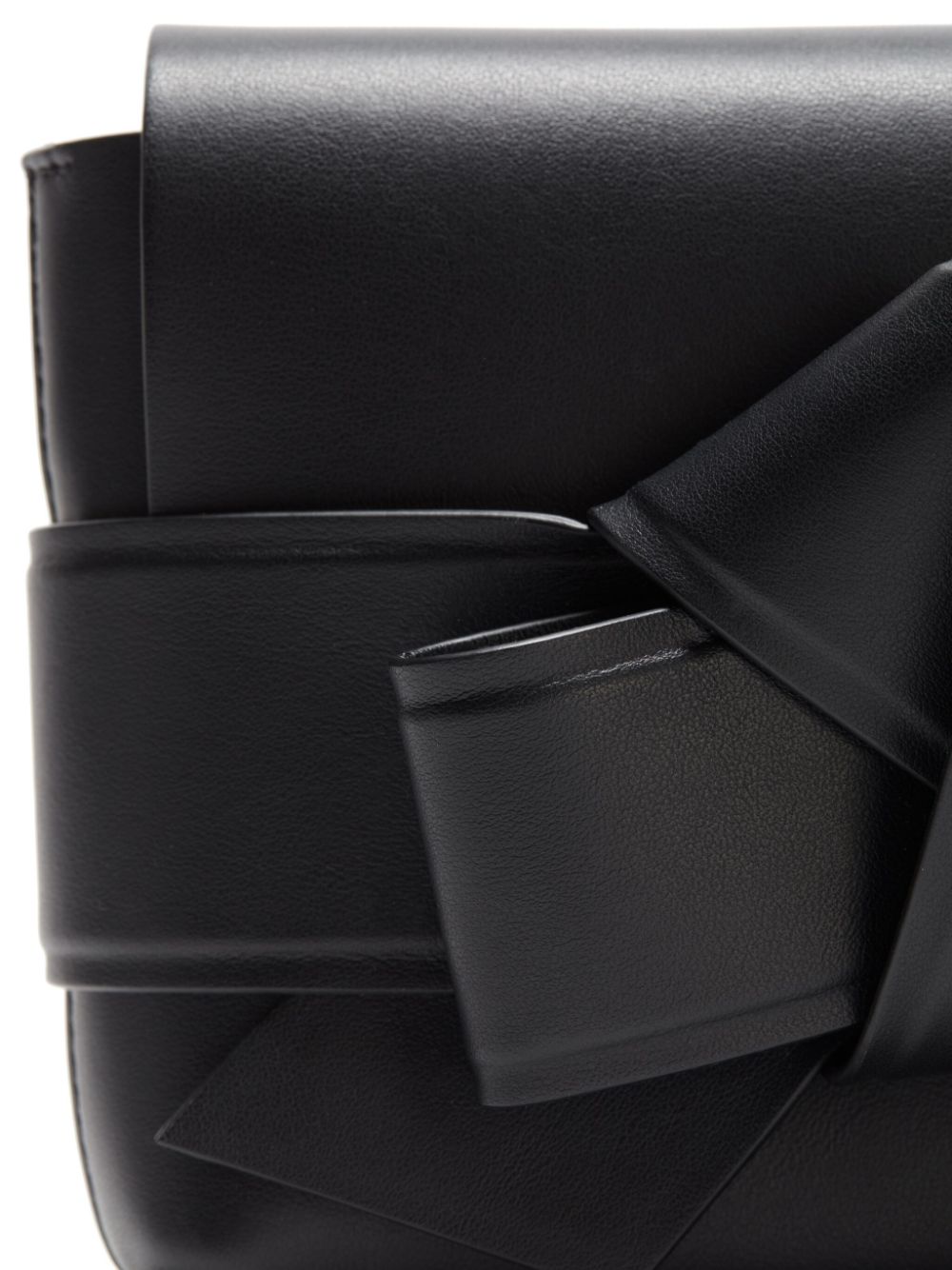 black leather smooth grain musubi knot detailing foldover top adjustable shoulder strap embossed logo to the front slip pocket to the front main compartment leather lining internal card slots