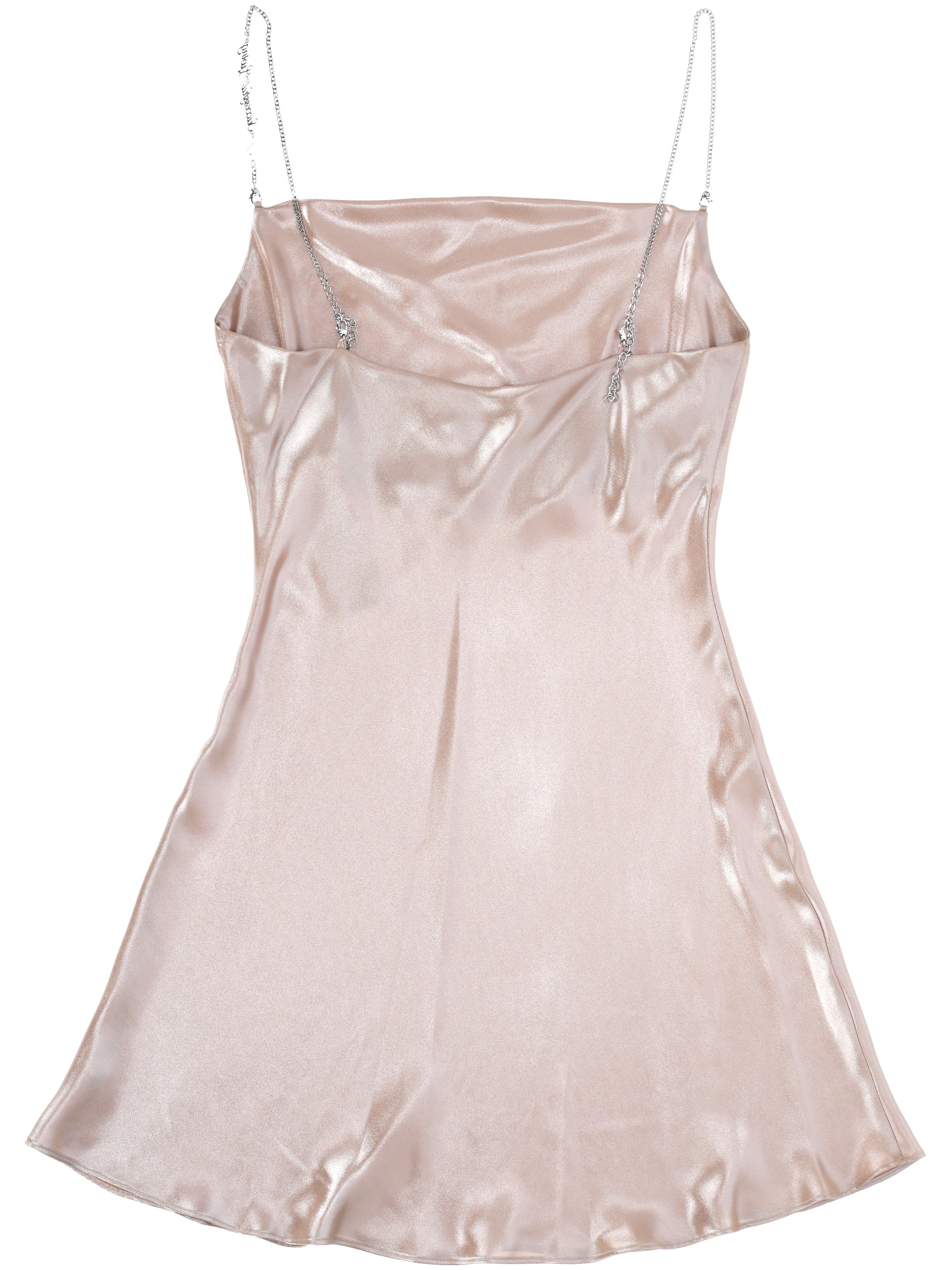 champagne satin finish cowl neck two chainlink shoulder straps slip silhouette straight hem thighlength