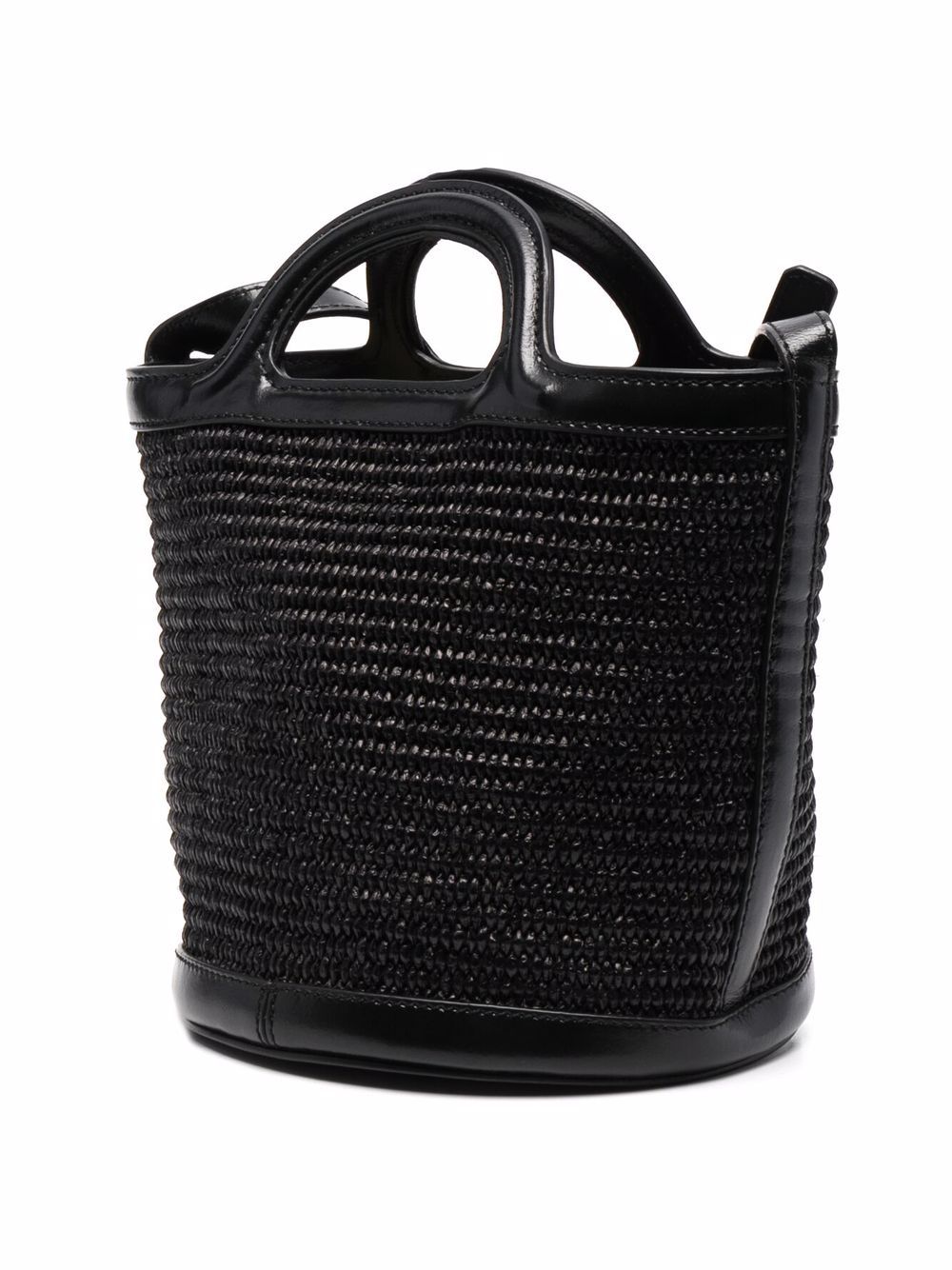 Black strawleather interwoven strap detailing embroidered logo to the front circular top handles full lining main compartment