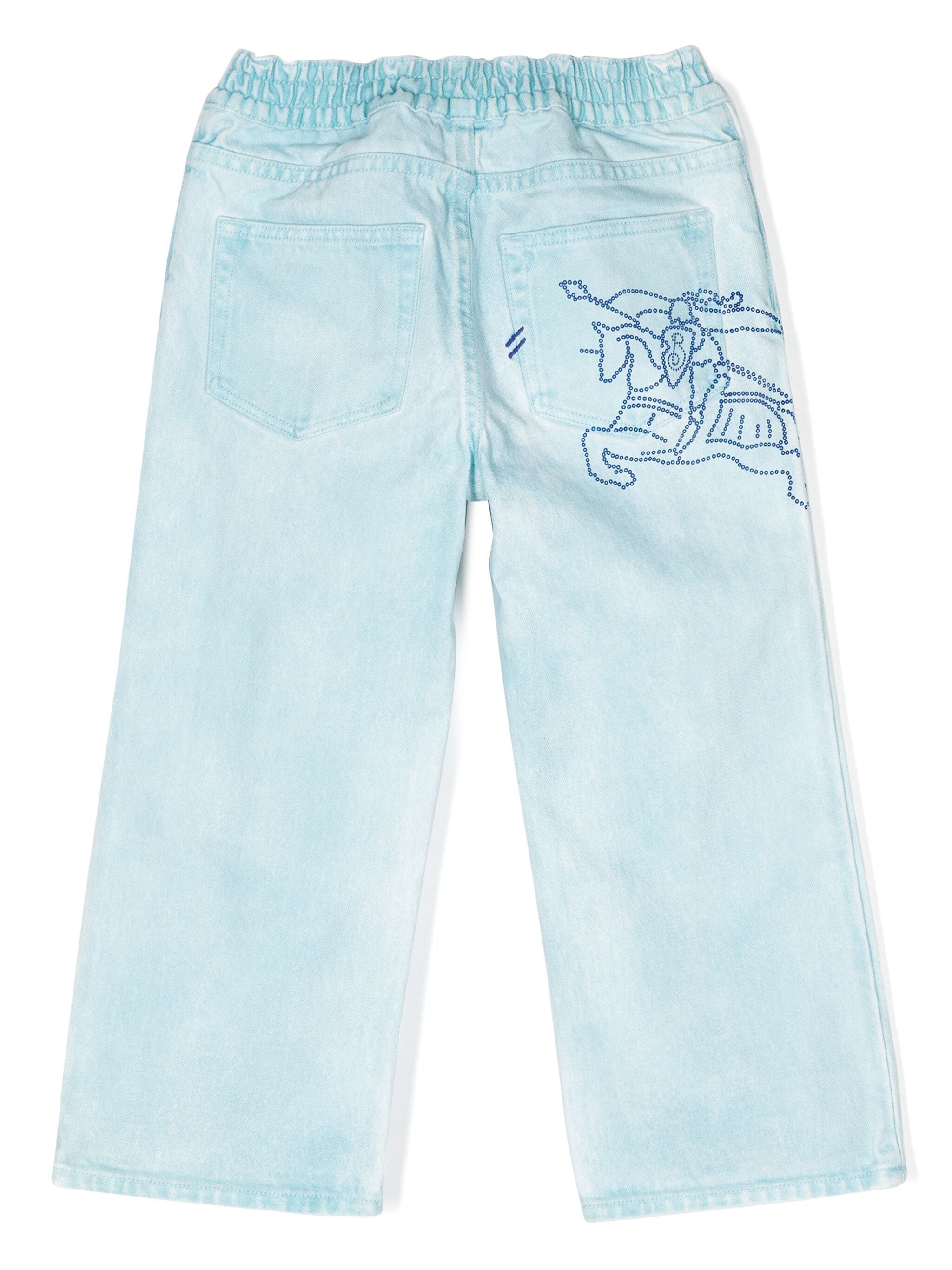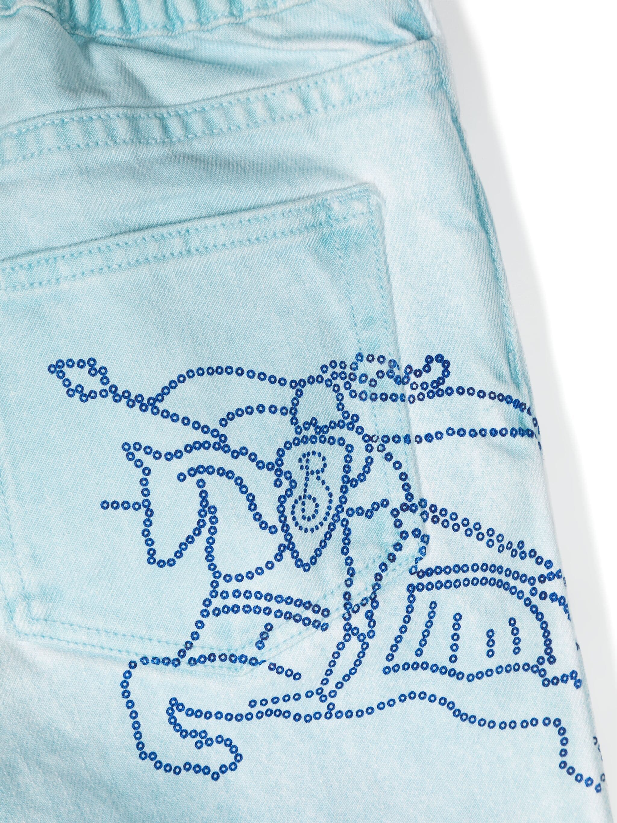 sky blue cotton denim elasticated waistband classic five pockets sequin print signature Equestrian Knight motif flared hem concealed fly and button fastening