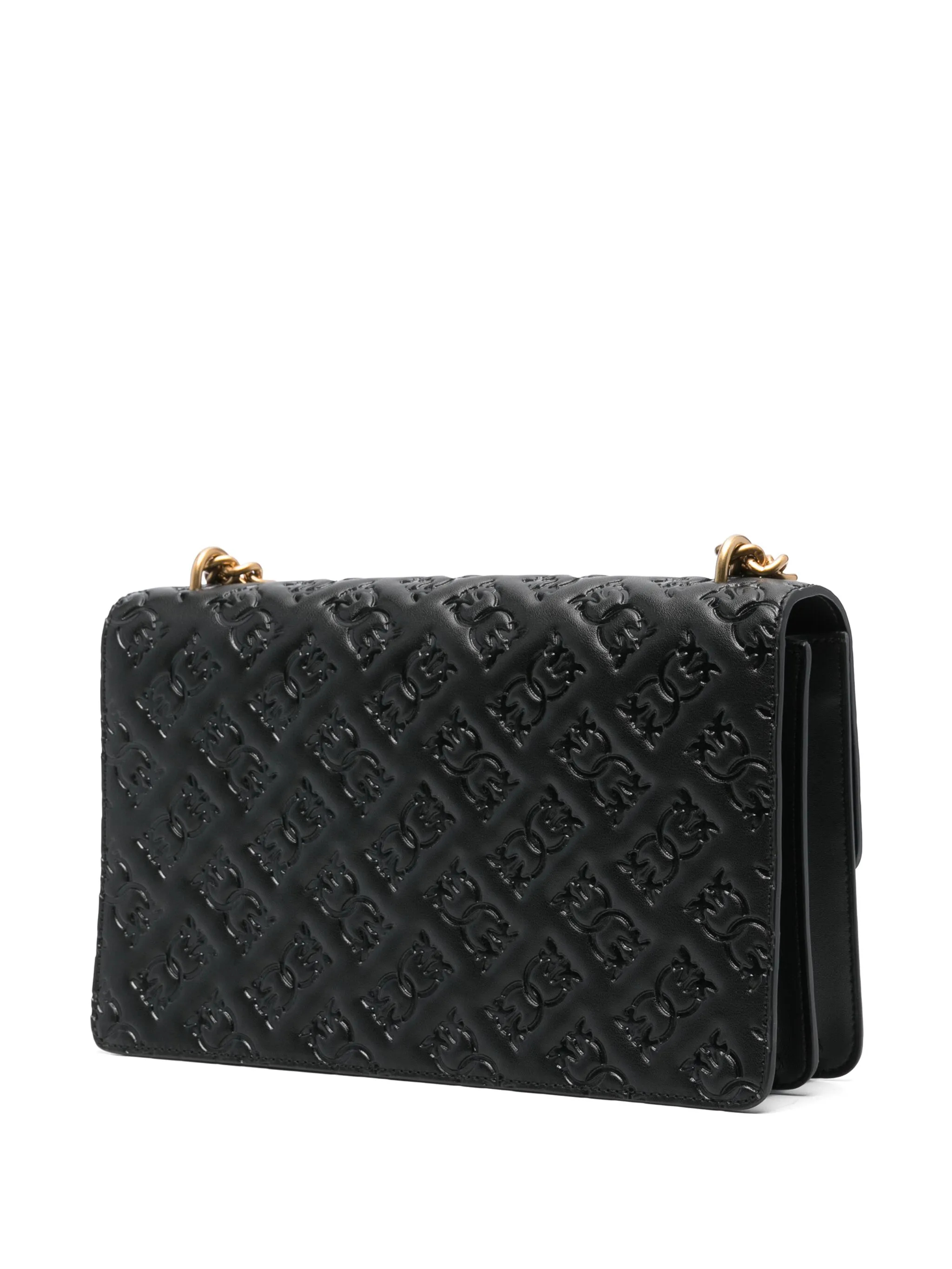 black calf leather smooth grain allover debossed logo Love Birds signature Love Birds buckle foldover top with magnetic fastening sliding chainlink shoulder strap partitioned compartment internal zipfastening pocket full lining This piece comes complete with a protective dust bag