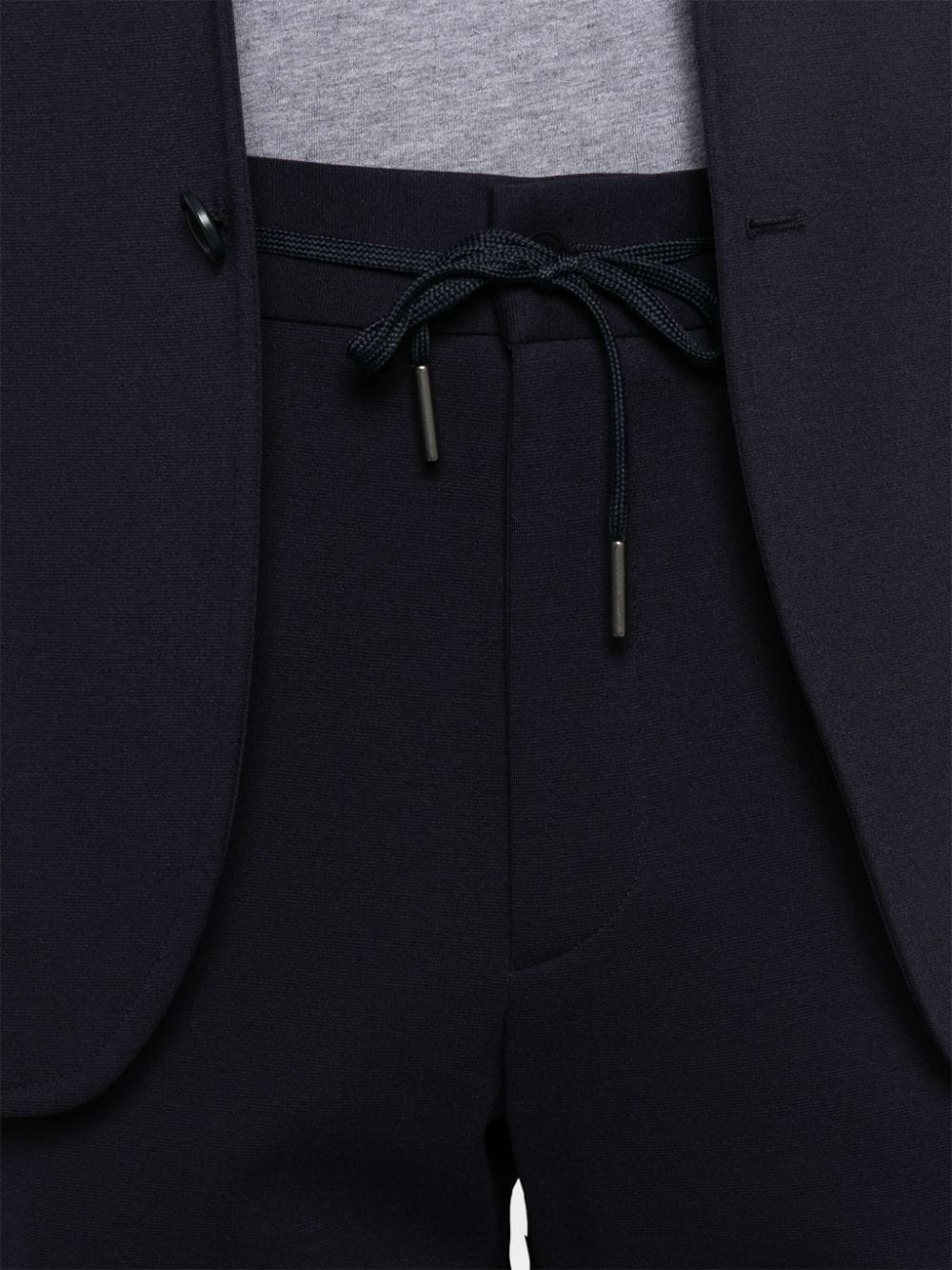 navy blue textured finish notched lapels long sleeves chest welt pocket two side patch pockets English rear vents front button fastening belt loops pleat detailing two side inset pockets pressed crease rear elasticated waistband two rear jetted pockets tapered leg front button and zip fastening