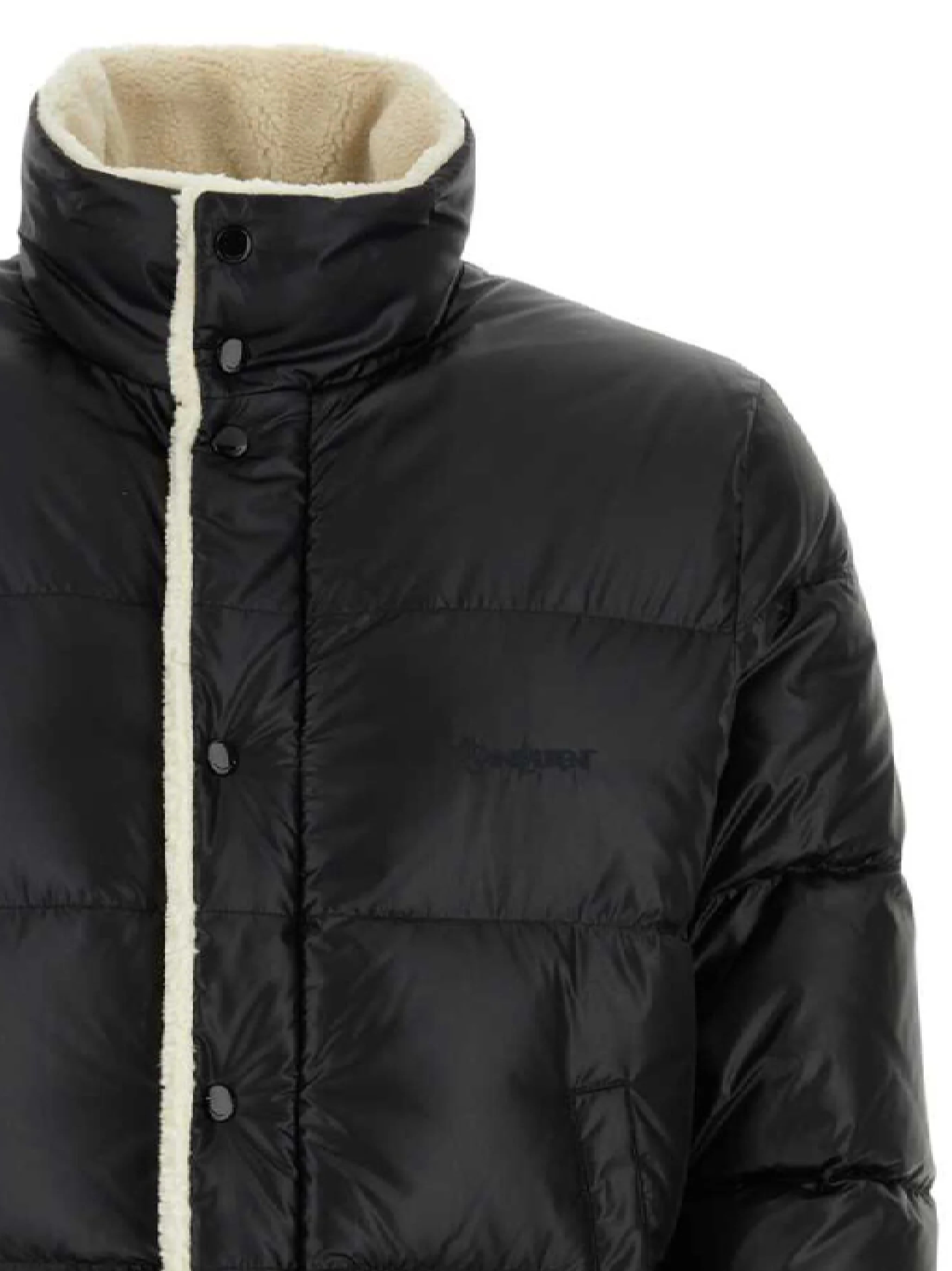 Black feather down padded design funnel neck shearling lining long sleeves front button and zip fastening embroidered logo at the chest two side inset pockets straight hem