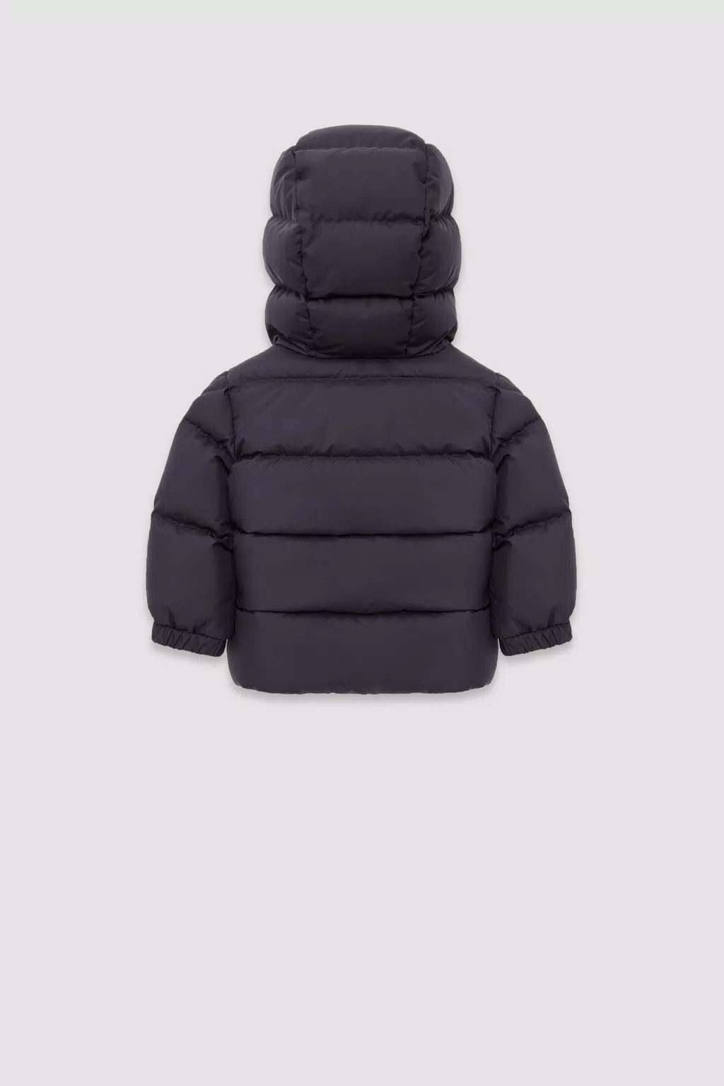 navy blue goose down padded design applique logo classic hood long sleeves elasticated cuffs two pressstud fastening side pockets straight hem full lining front zip fastening