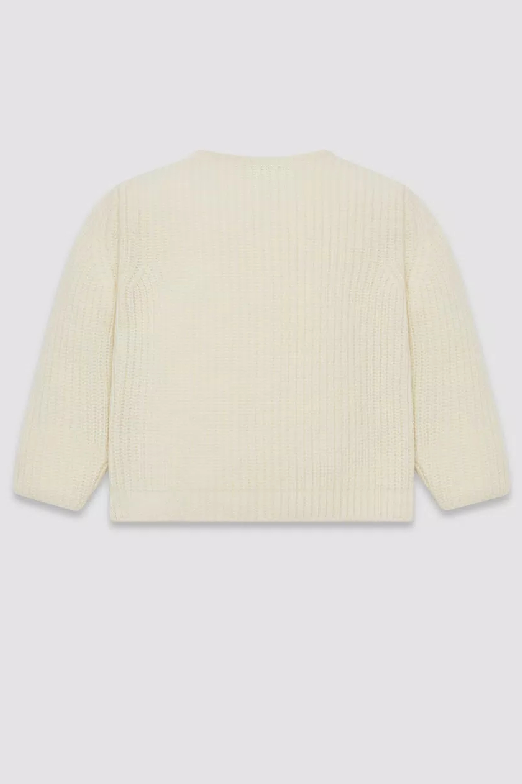 offwhite virgin wool ribbed knit downfeather filling panelled design front zip fastening crew neck chevron quilting long sleeves logo patch at the sleeve two side flap pockets straight hem