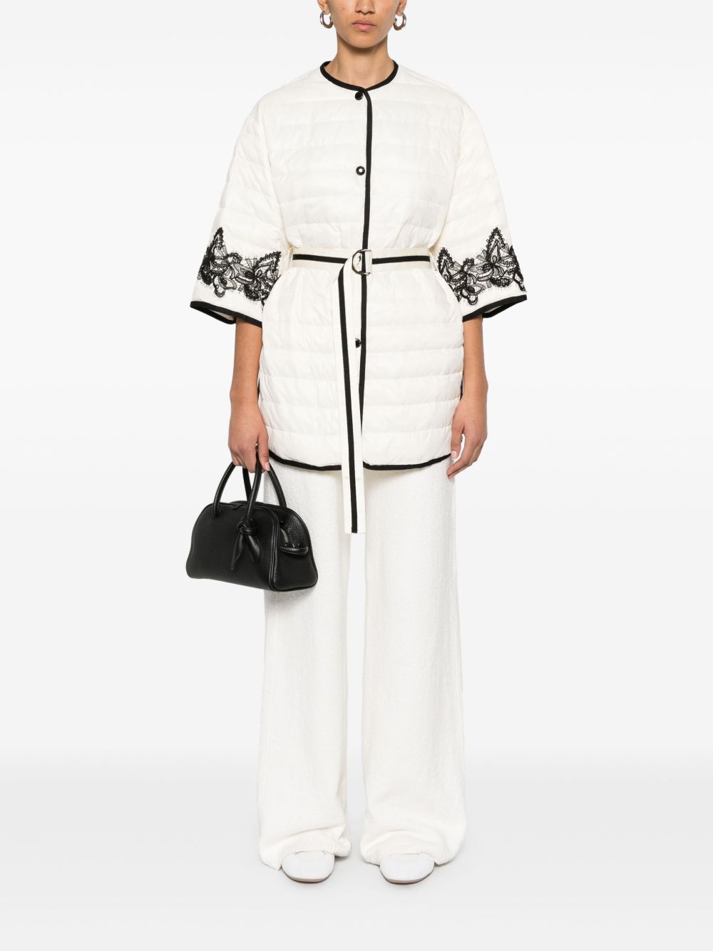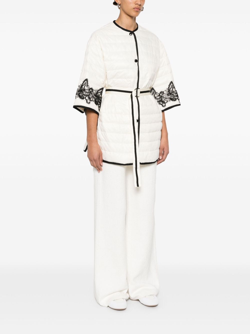 white front press-stud fastening detachable adjustable waist strap side slits two side inset pockets