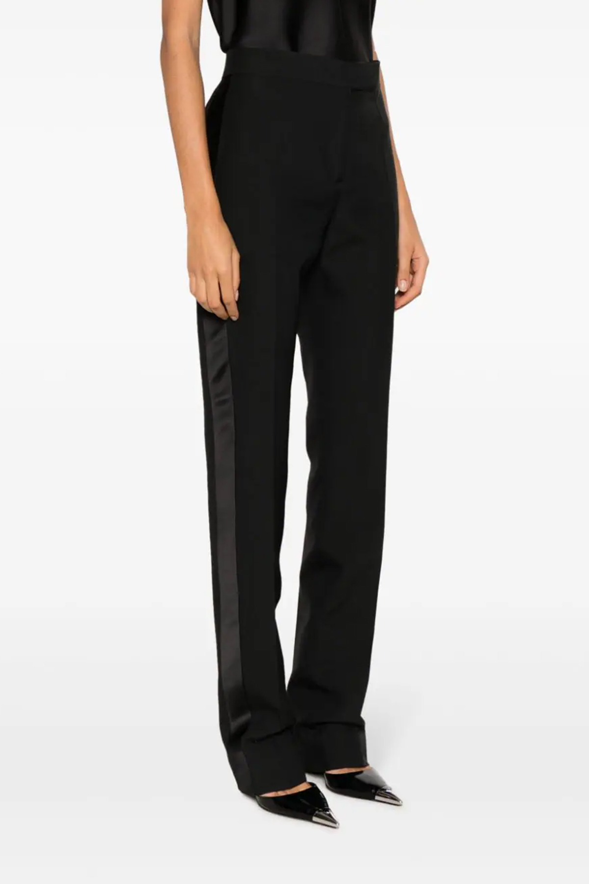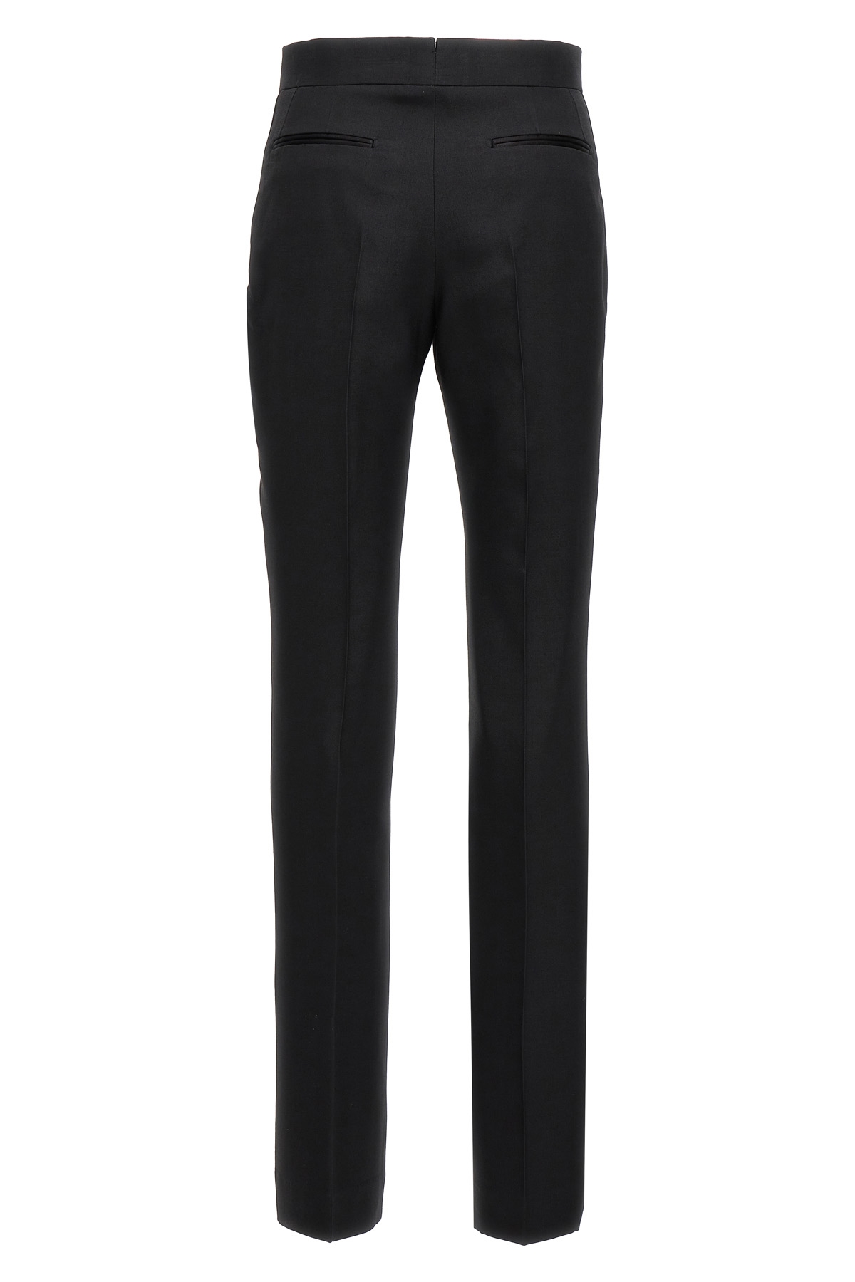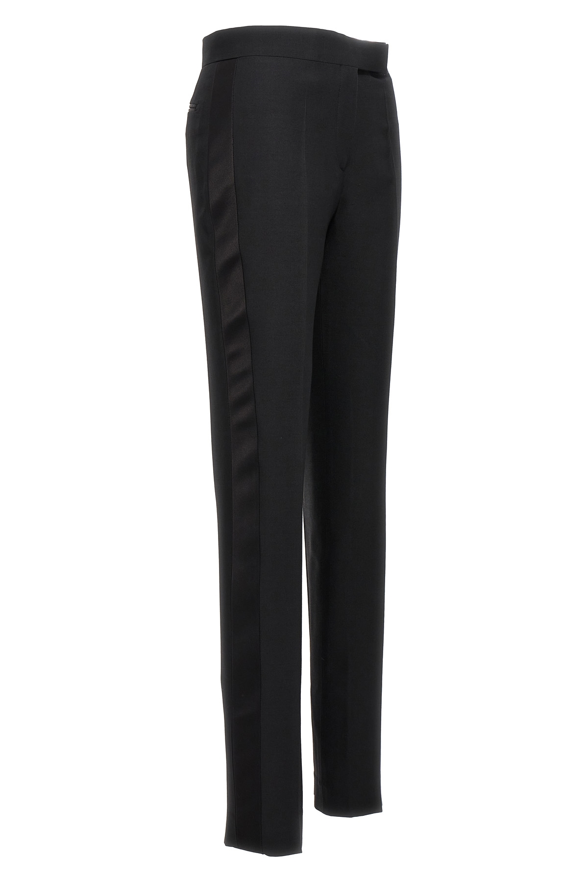 Wool and silk tuxedo pants, hook and button zip closure, pockets, and satin side bands.