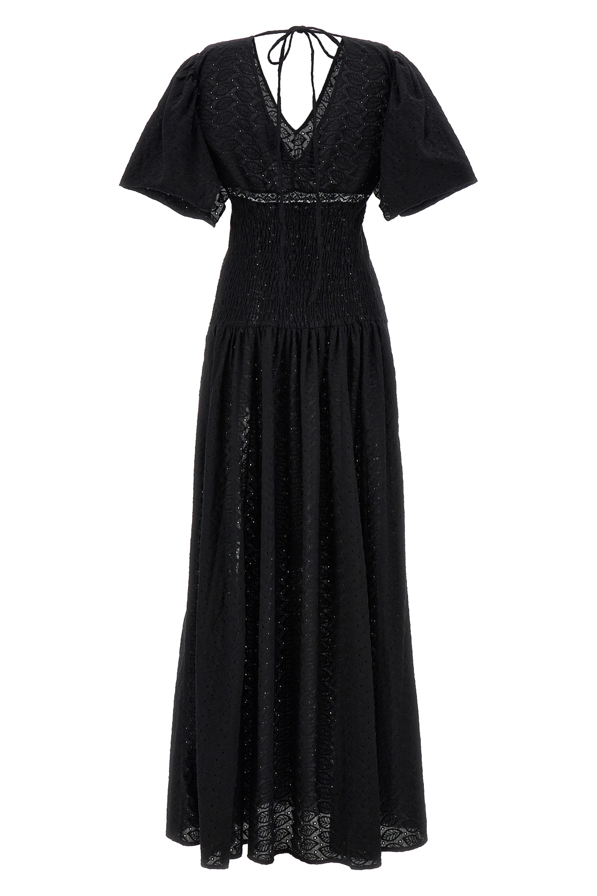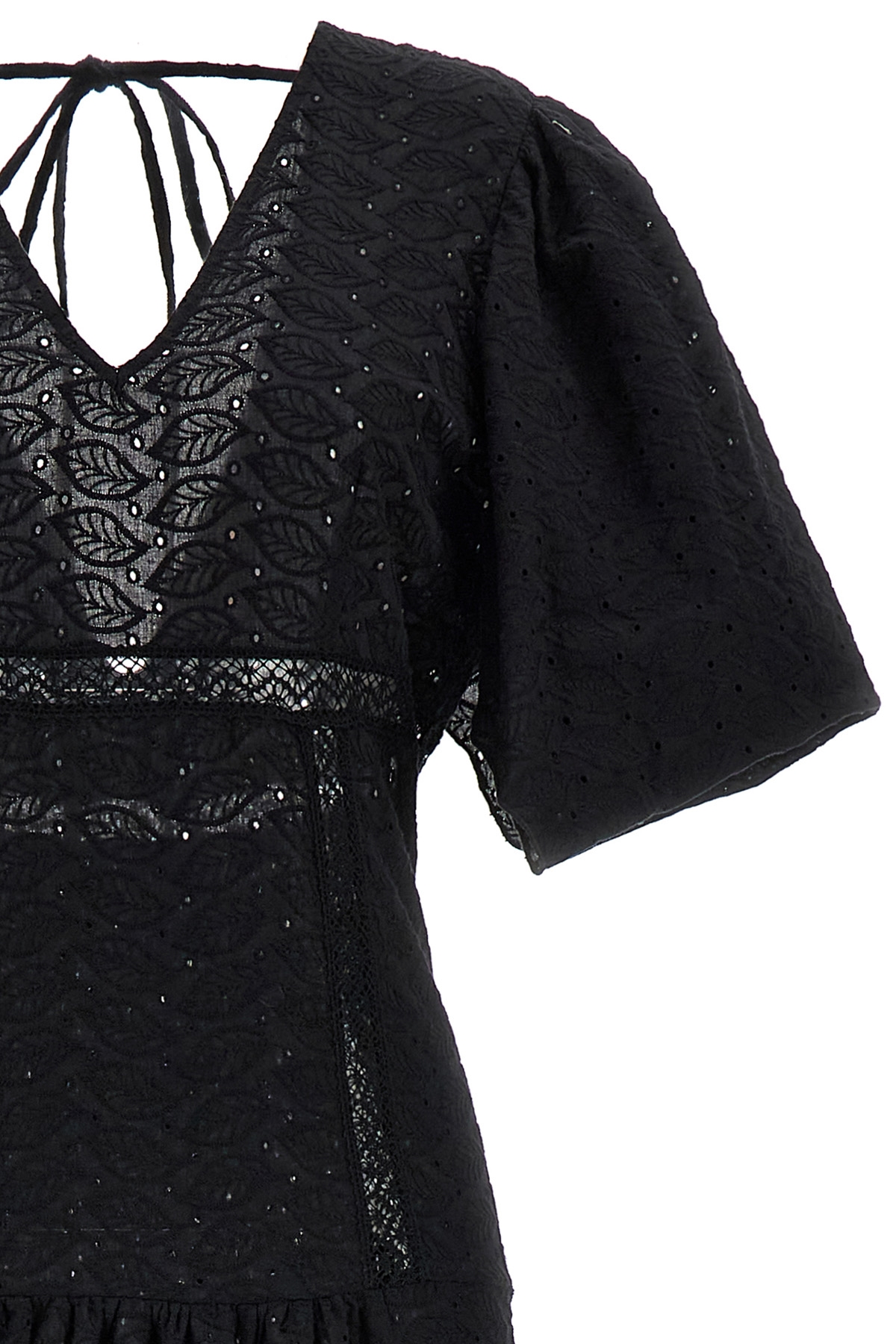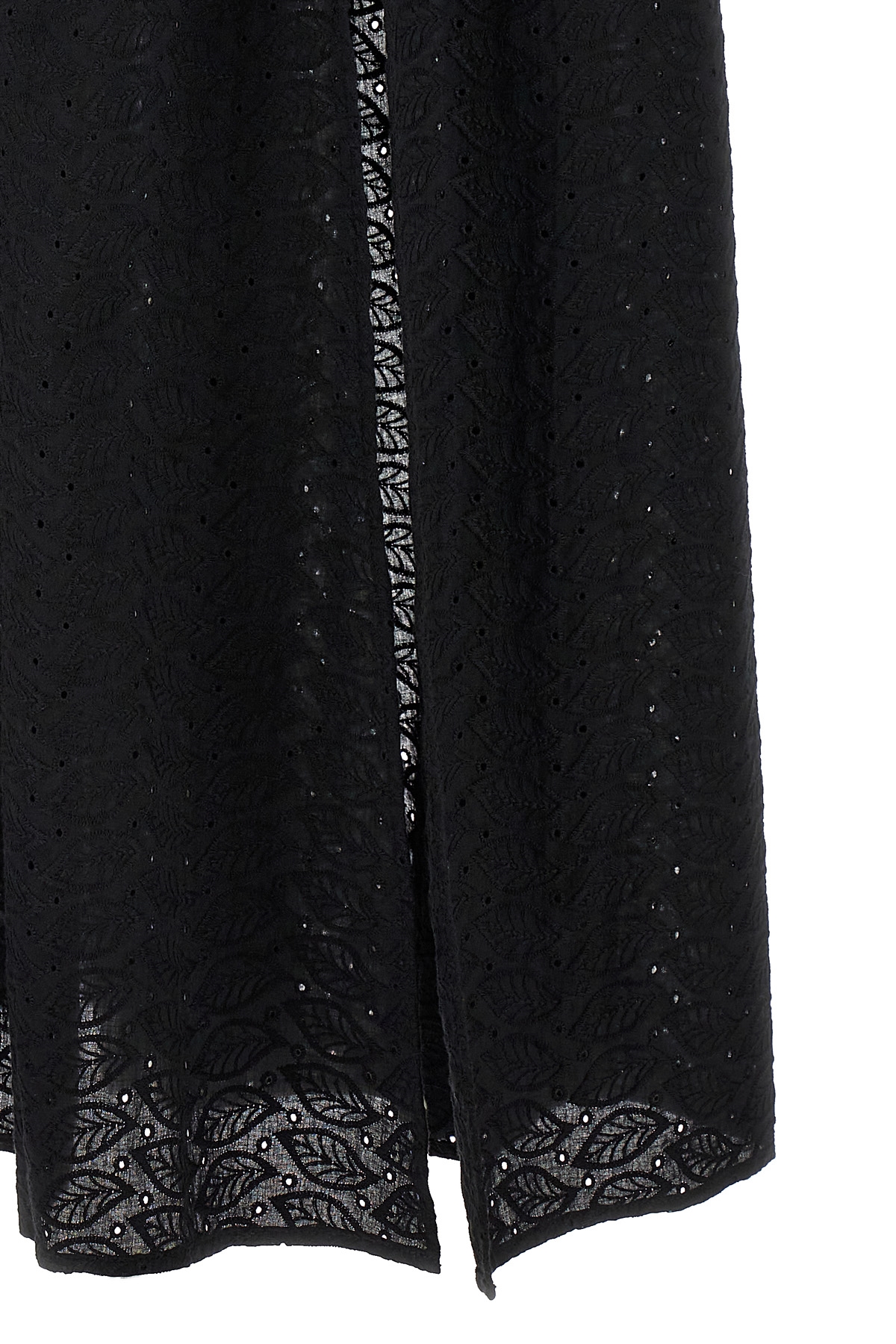 'Rosellina' broderie anglaise cotton dress with V-neck at the front and back, long sleeves with opening, wide side slits, pockets.