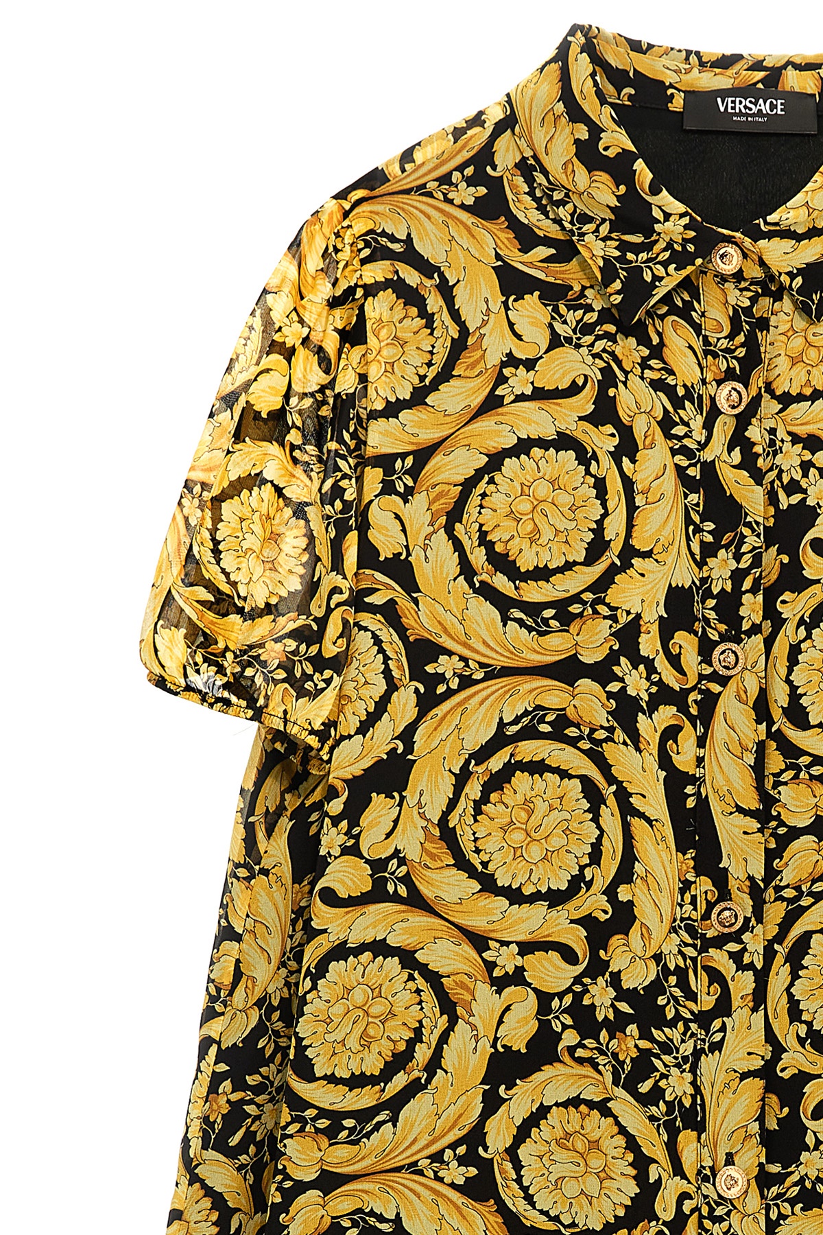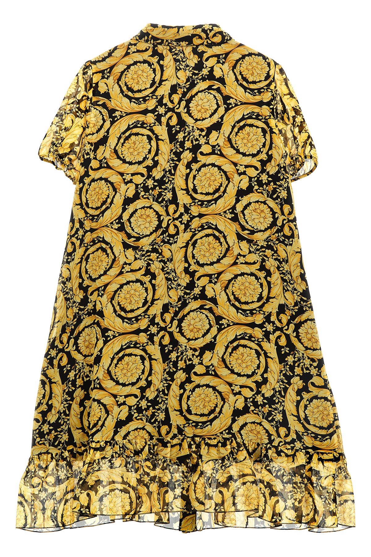 KIDS 'Barocco' print silk shirt dress with front button closure, short sleeves.