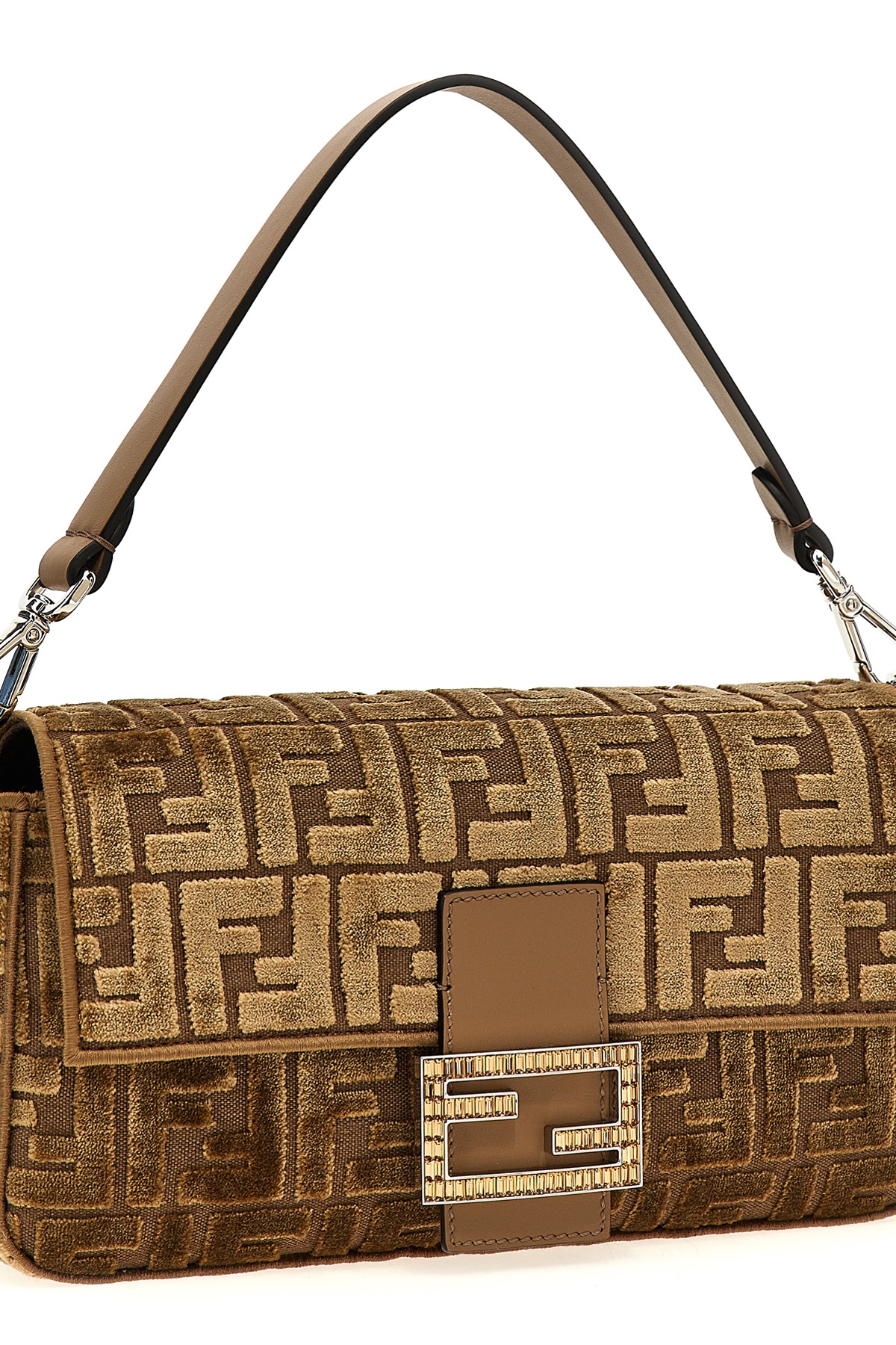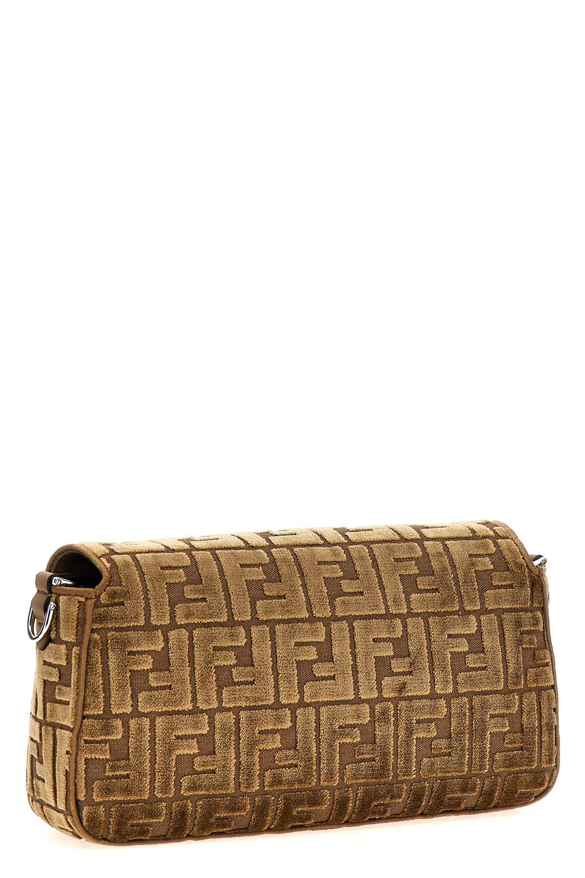 Jacquard velvet 'Baguette' shoulder bag with all-over embossed FF pattern, magnetic flap closure with jewel logo plaque, removable short handle, adjustable and removable shoulder strap.