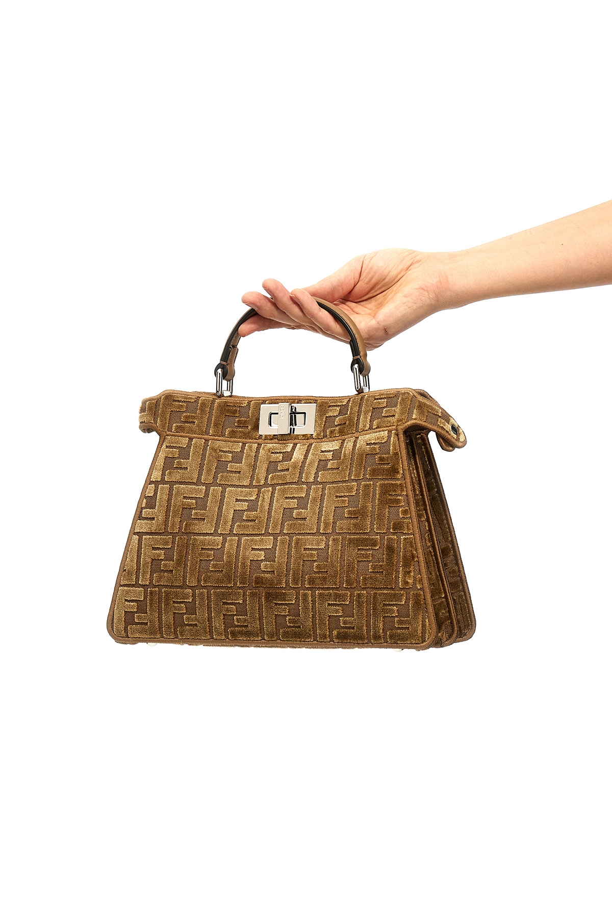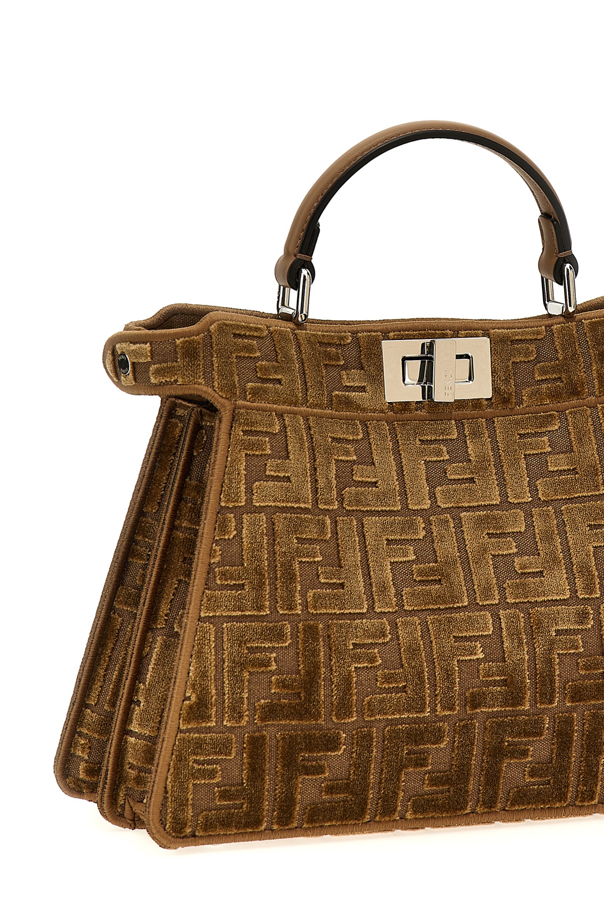 FF jacquard all over velvet Peekaboo ISeeU Small handbag, iconic twist closure on both sides, fixed leather handle, adjustable and removable leather shoulder strap.