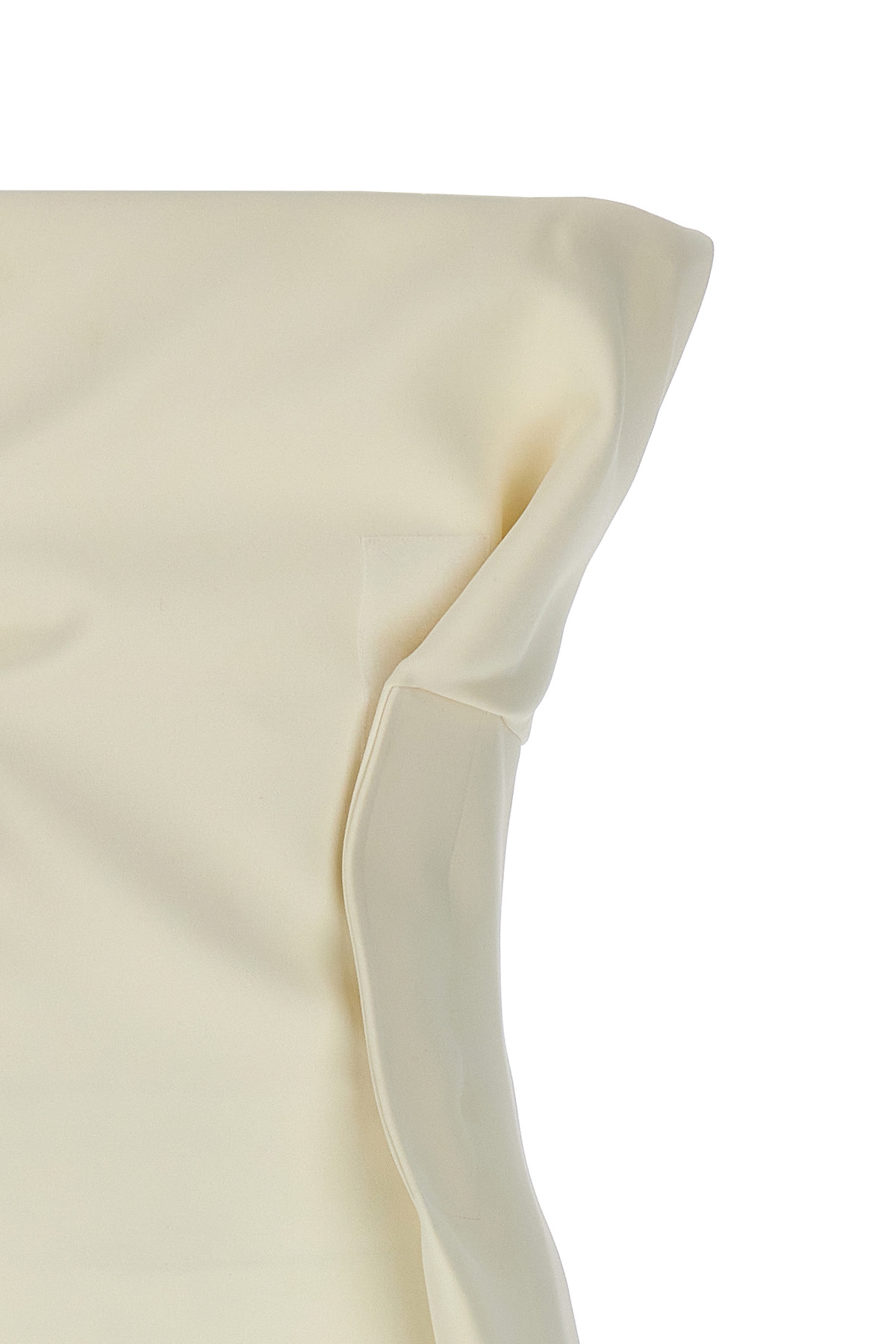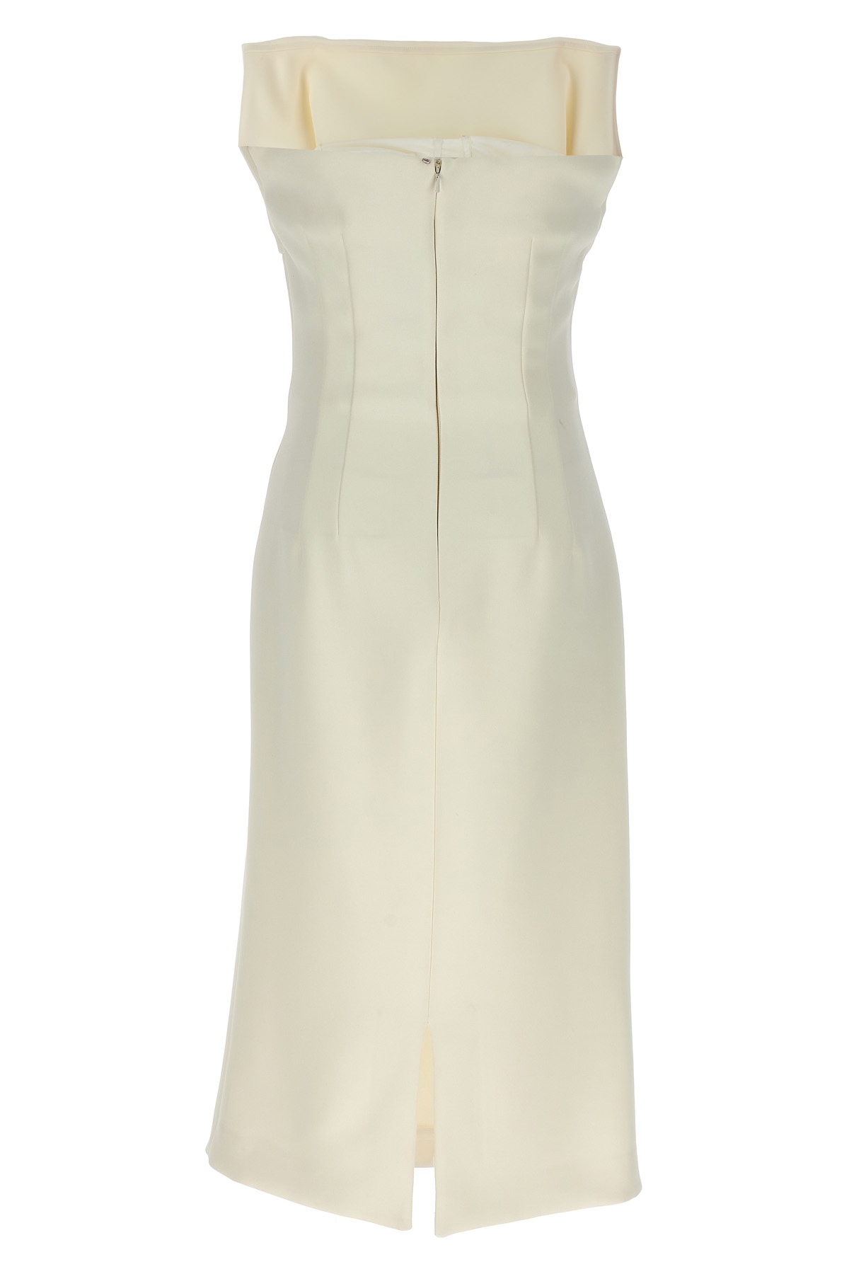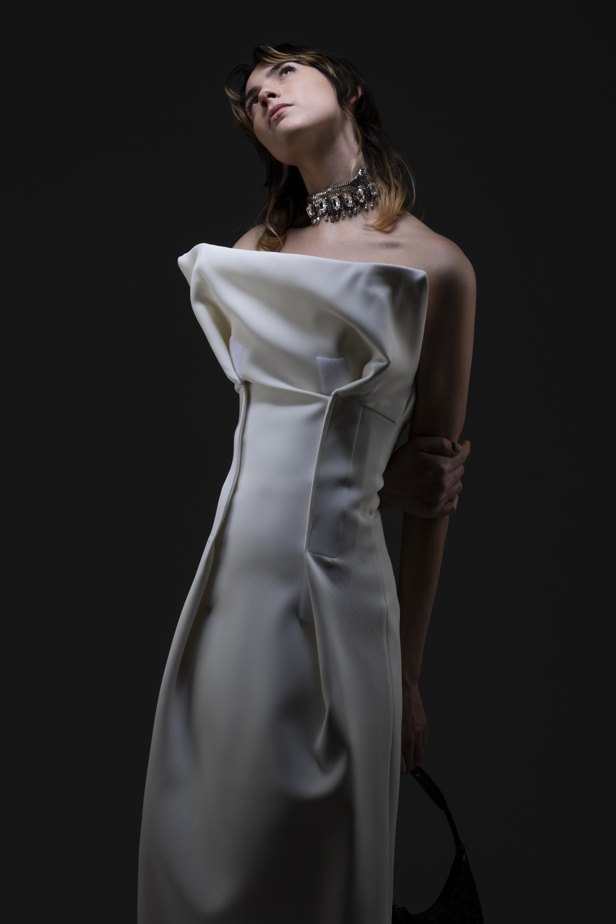 'Adito' sleeveless midi dress, cinched waist with two macro side folds, double pin tuck at the back, removable and adjustable shoulder padding, back zip closure.