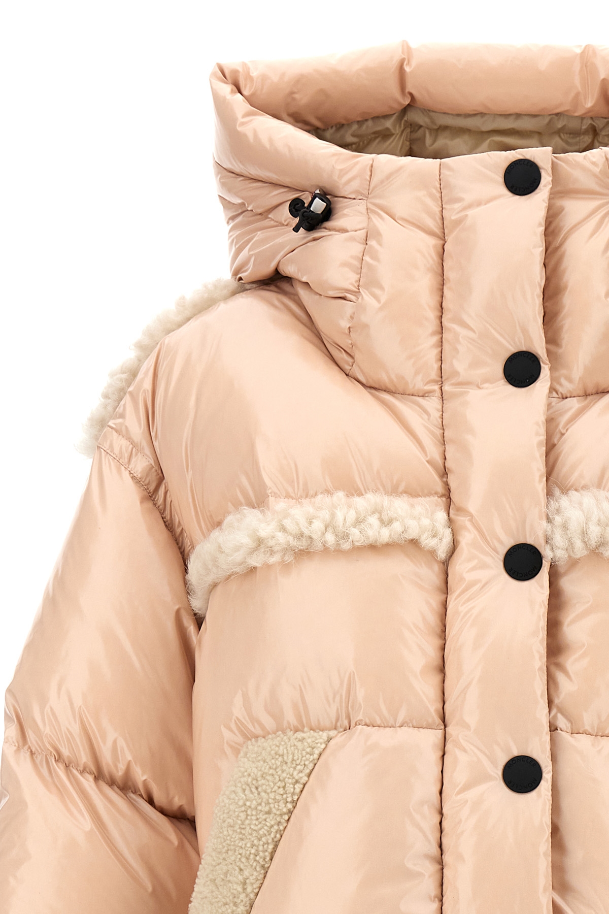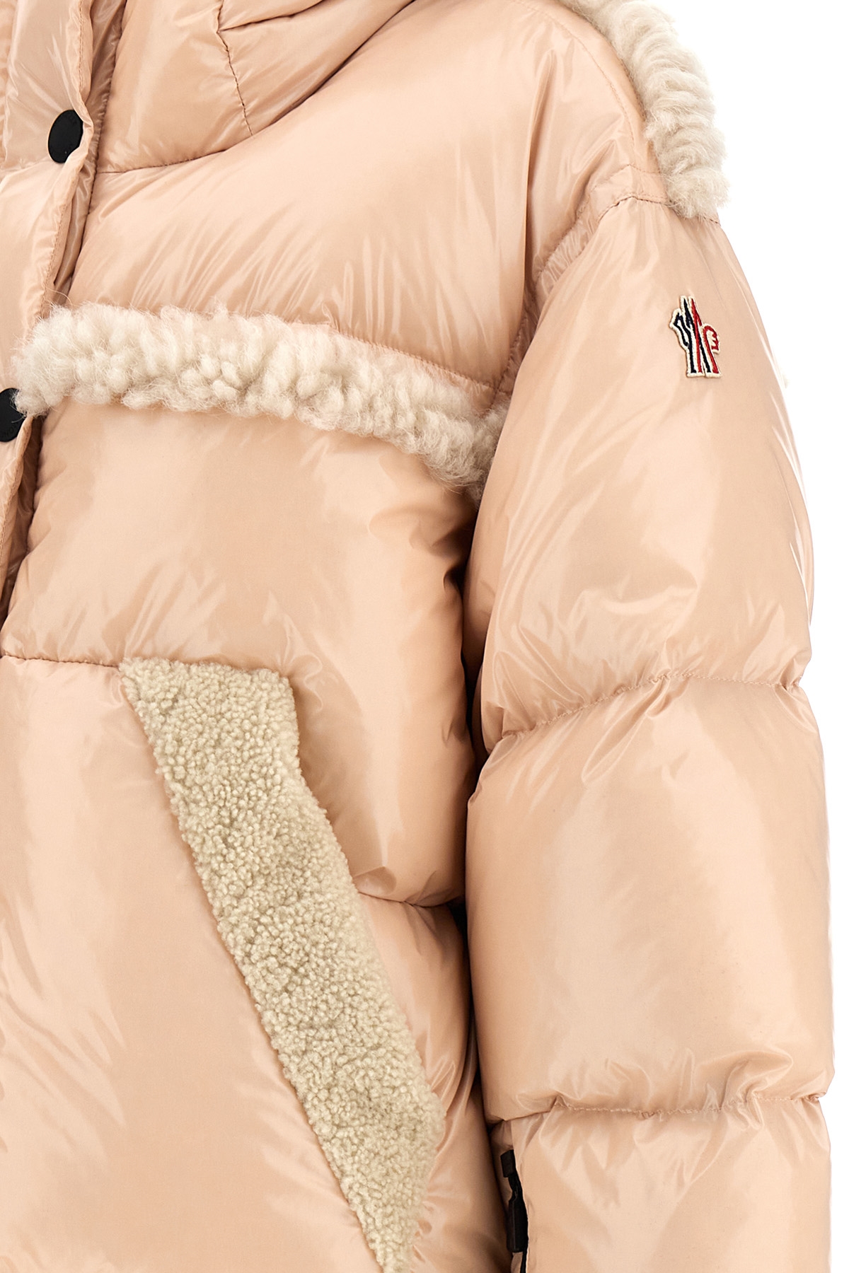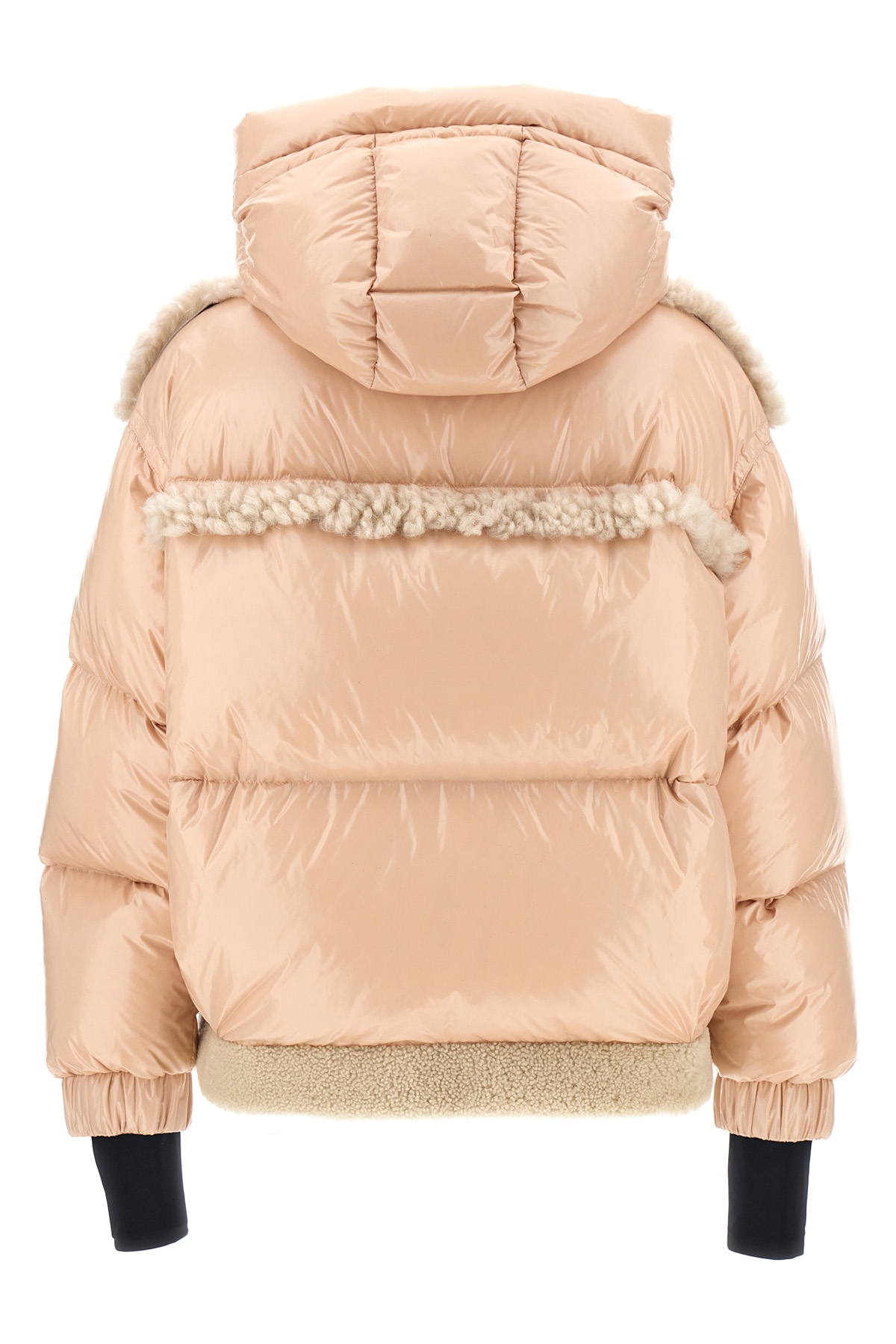 'Eibsee' shiny nylon down jacket with feather padding, sheepskin inserts, zip and button closure, hood, long sleeves with adjustable elastic cuffs and knitted cuffs, inner gaiter.