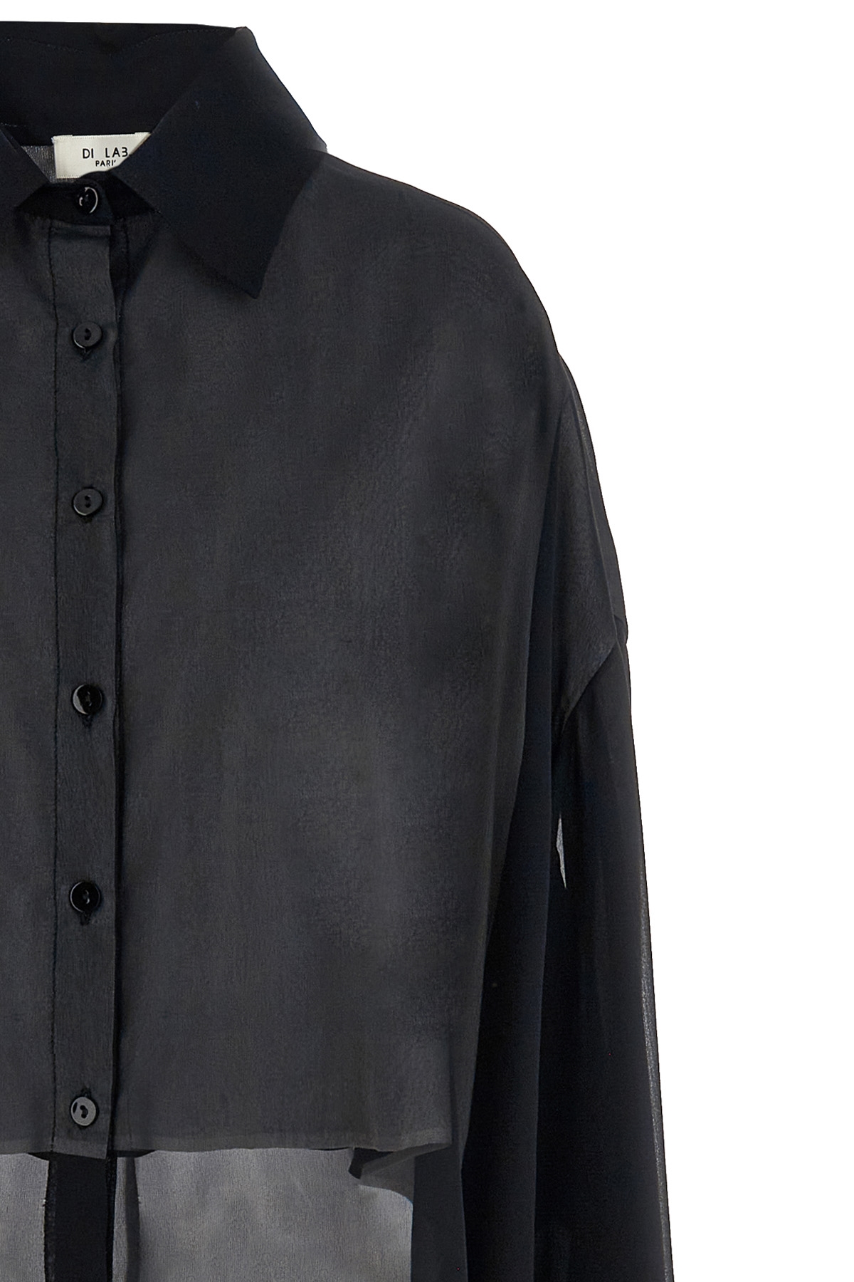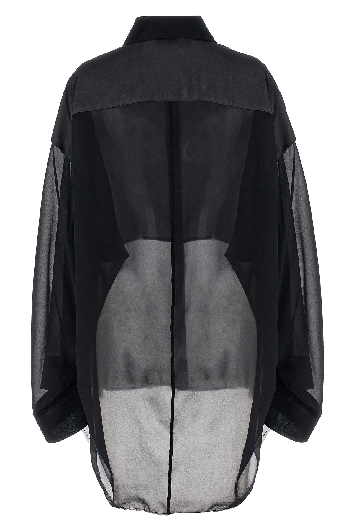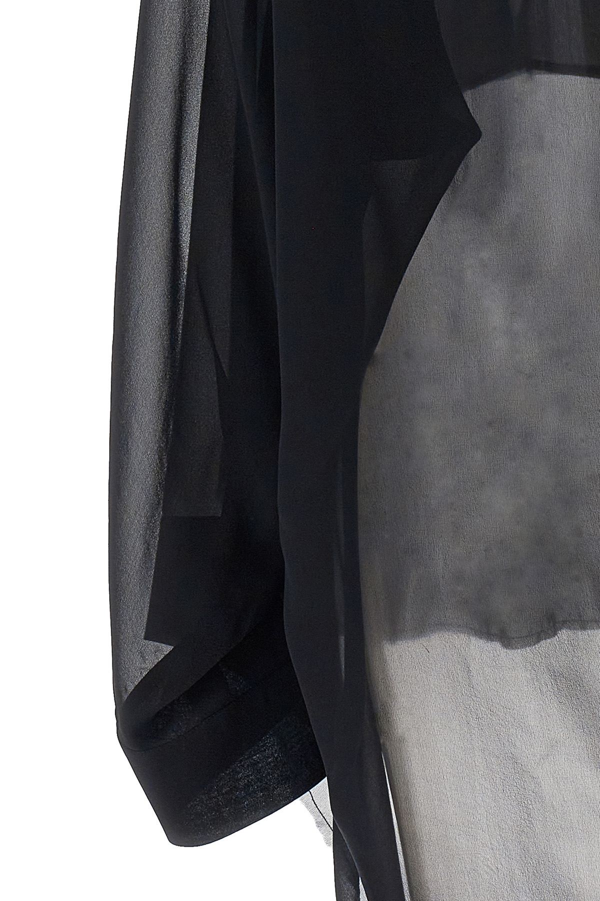 Semi-transparent silk shirt with opaque front inner panel, button closure, asymmetric hem with raw cut hem, long wide sleeves with cuffs and dropped shoulders. Coloring: very dark blue