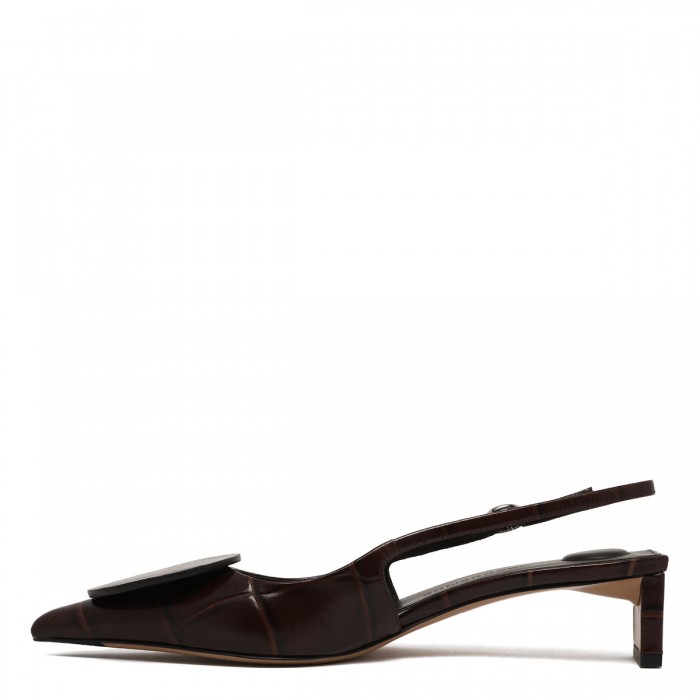 Black smooth leather The Duelo slingback pumps from Jacquemus featuring circle and square decorative patches, slingback strap with buckle closure, pointed toe, flat sole, leather sole and lining.