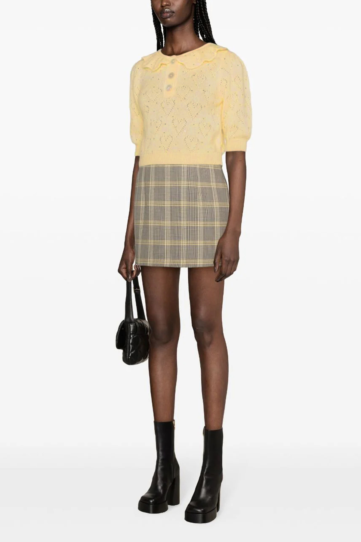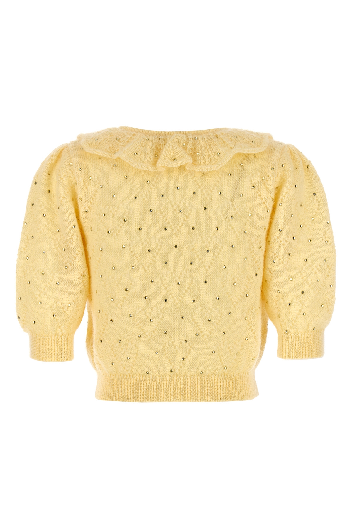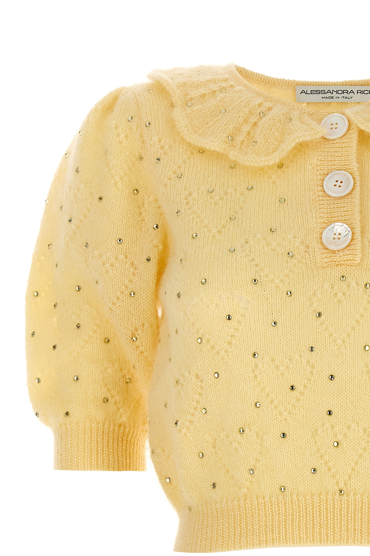 Mohair blend sweater with rhinestone applique, short sleeves with cuffs.