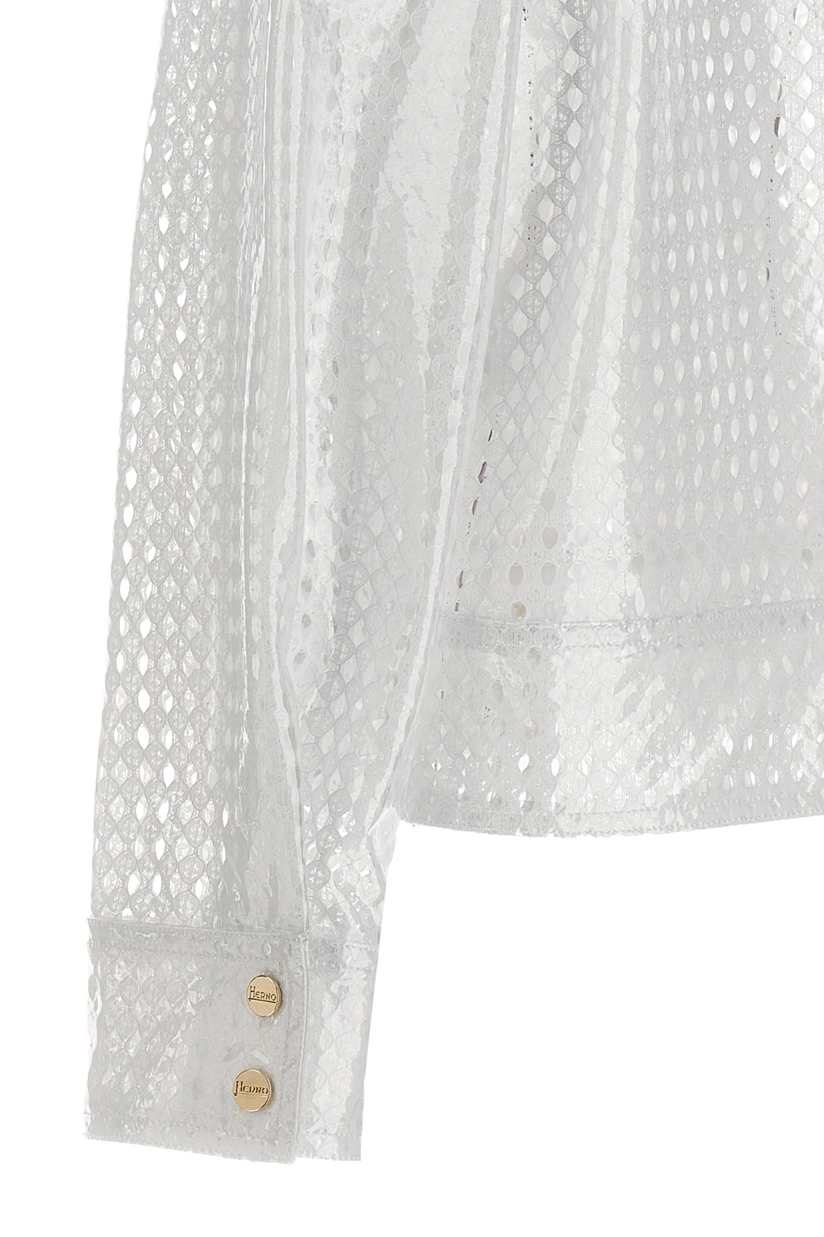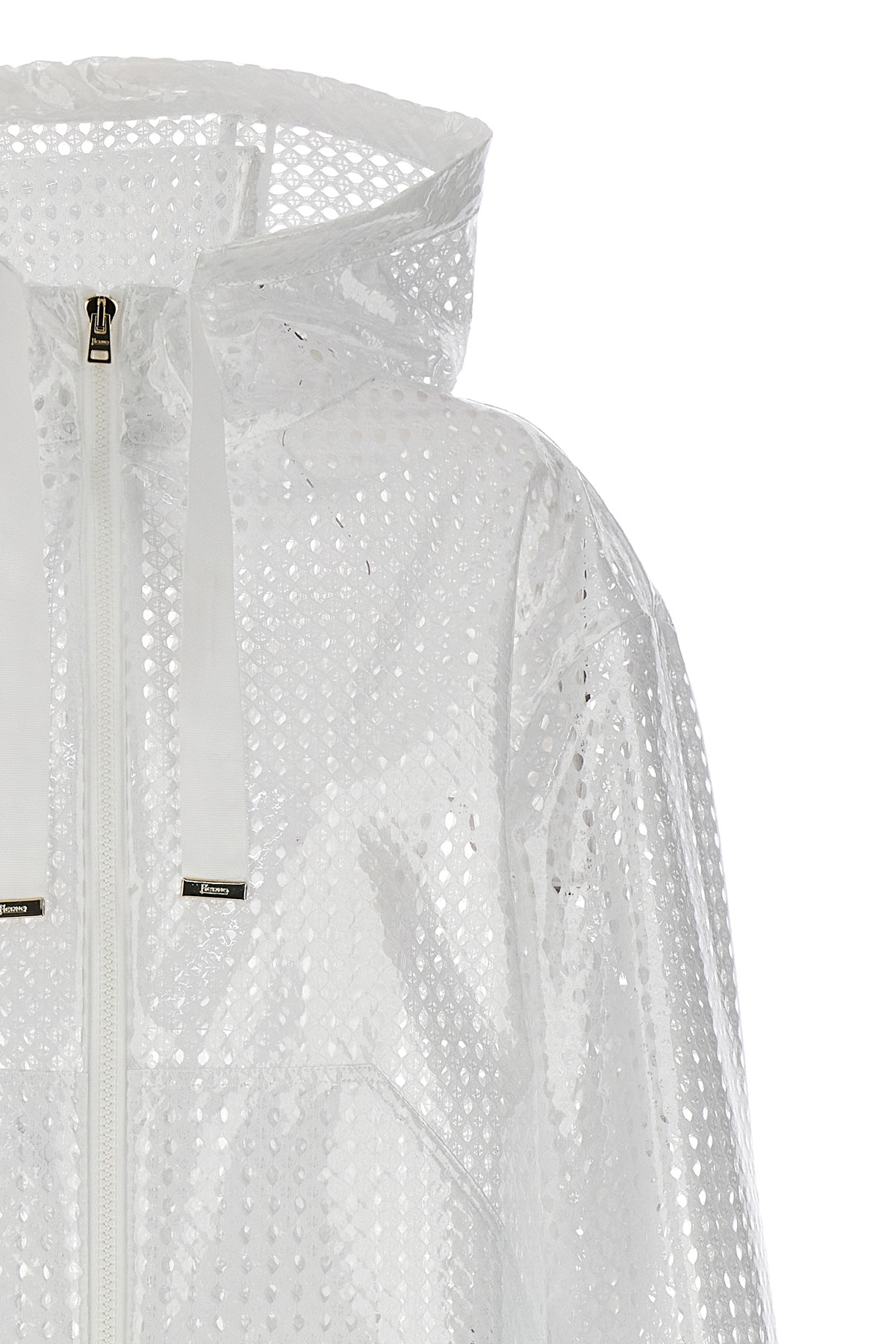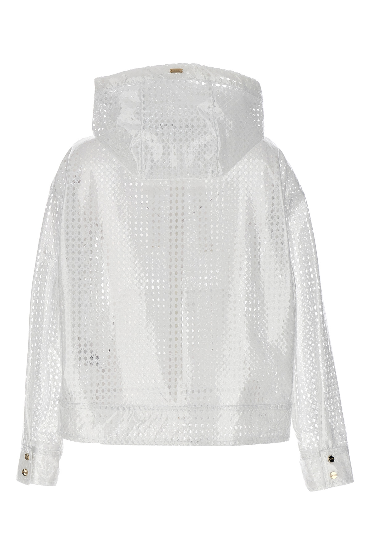 Plasticized crochet hooded jacket, zip closure, pockets, long cuffed sleeves.