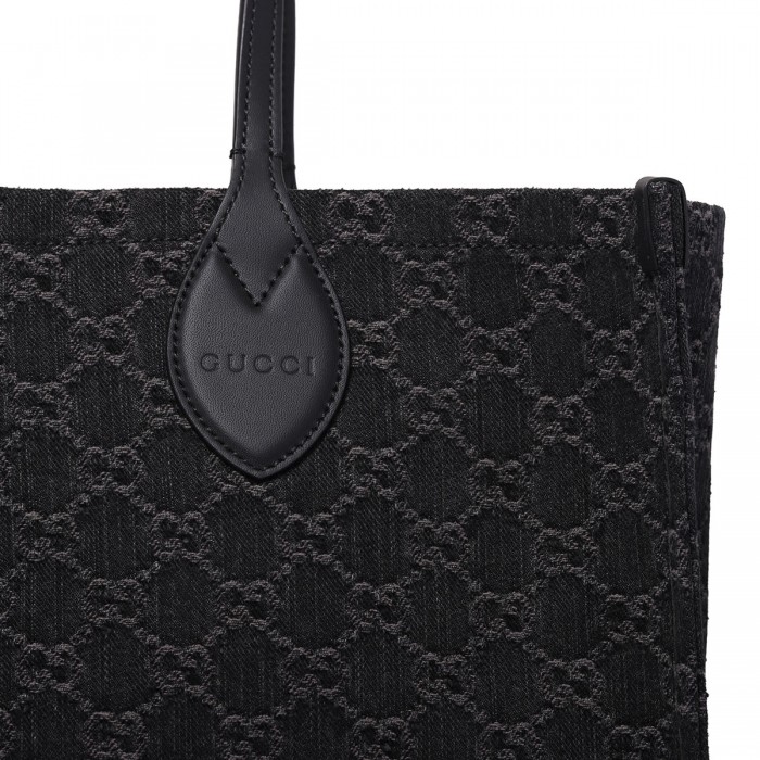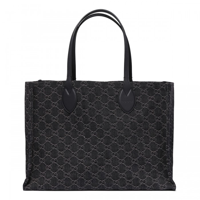Black cotton canvas Ophidia large tote bag from Gucci featuring GG motif printed allover, black leather detail, leather top handle, internal leather pouch with zip closure, silver-toned hardware.