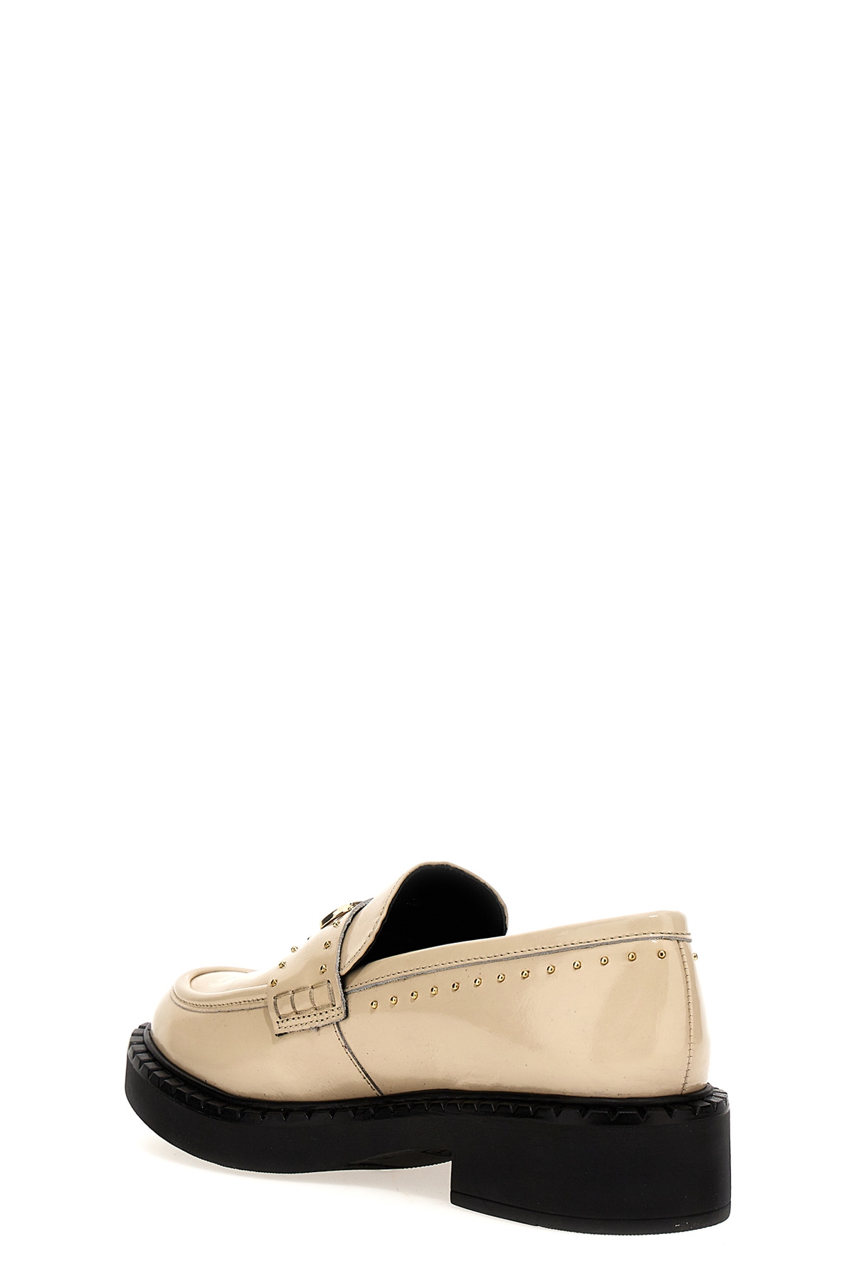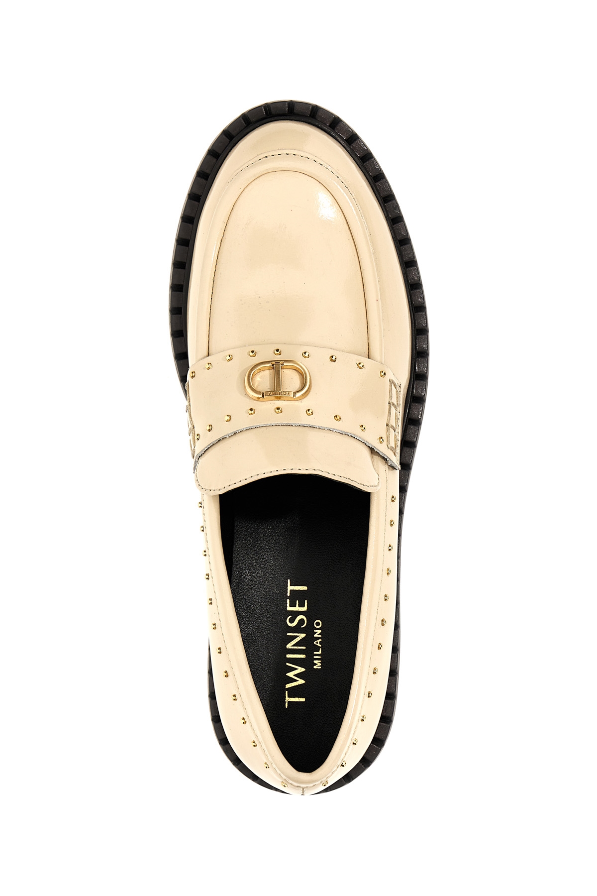 Leather loafers with front logo applique, gold metal mini studs, and rubber sole.