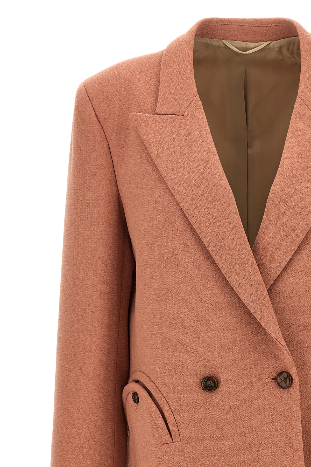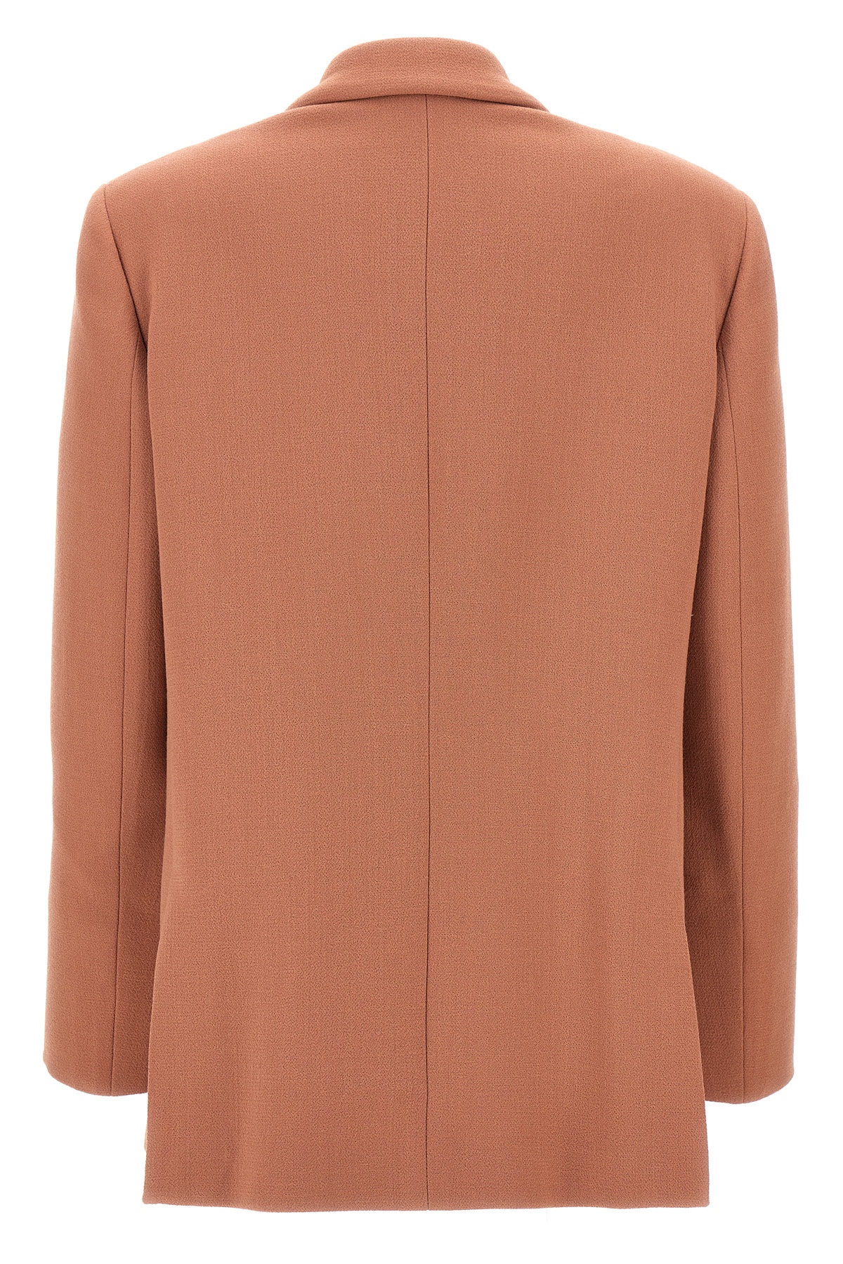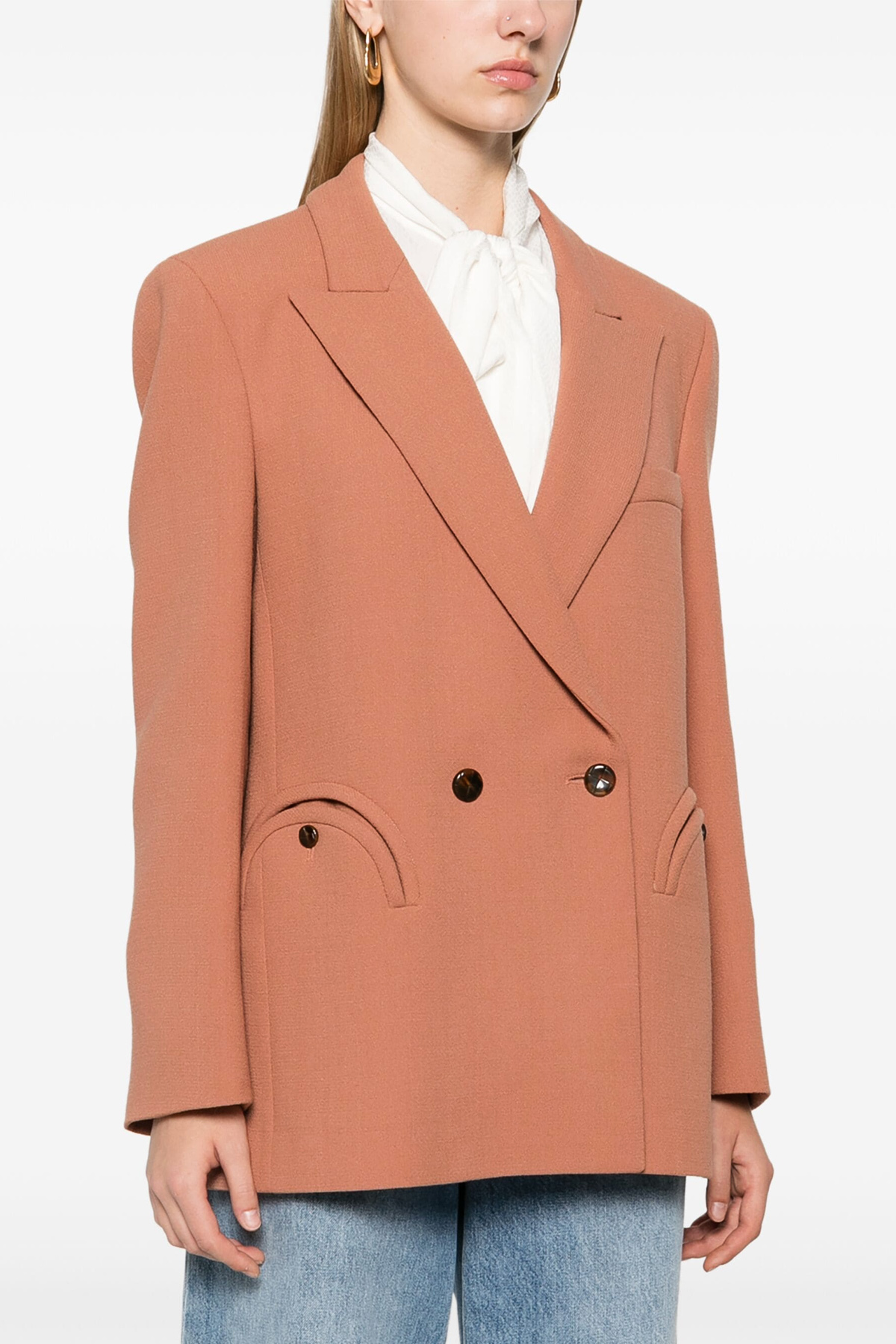 'Resolute Everynight' double-breasted wool blazer with button closure, padded shoulders, pockets, long sleeves, back vents.
