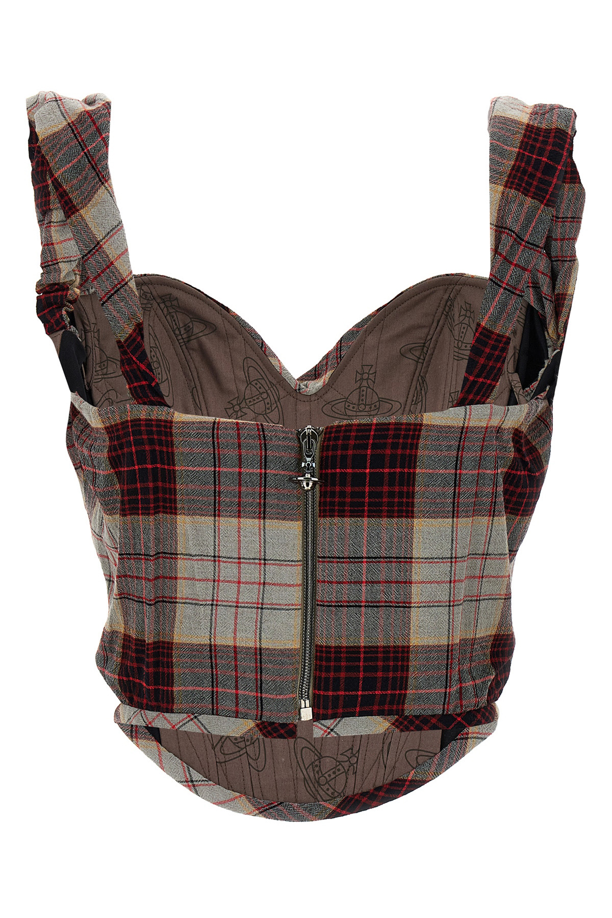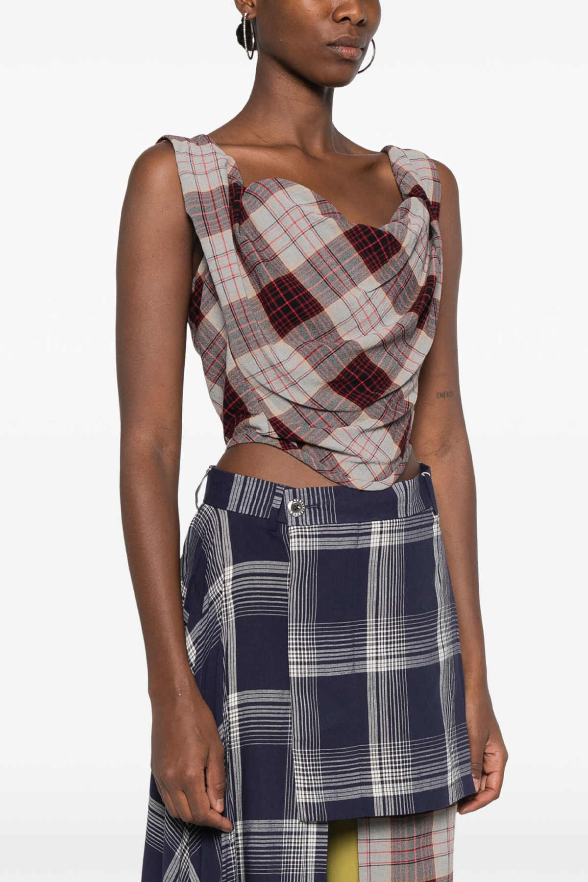 'Sunday Corset' check print viscose and wool blend top, fenced pattern, back zip closure.
