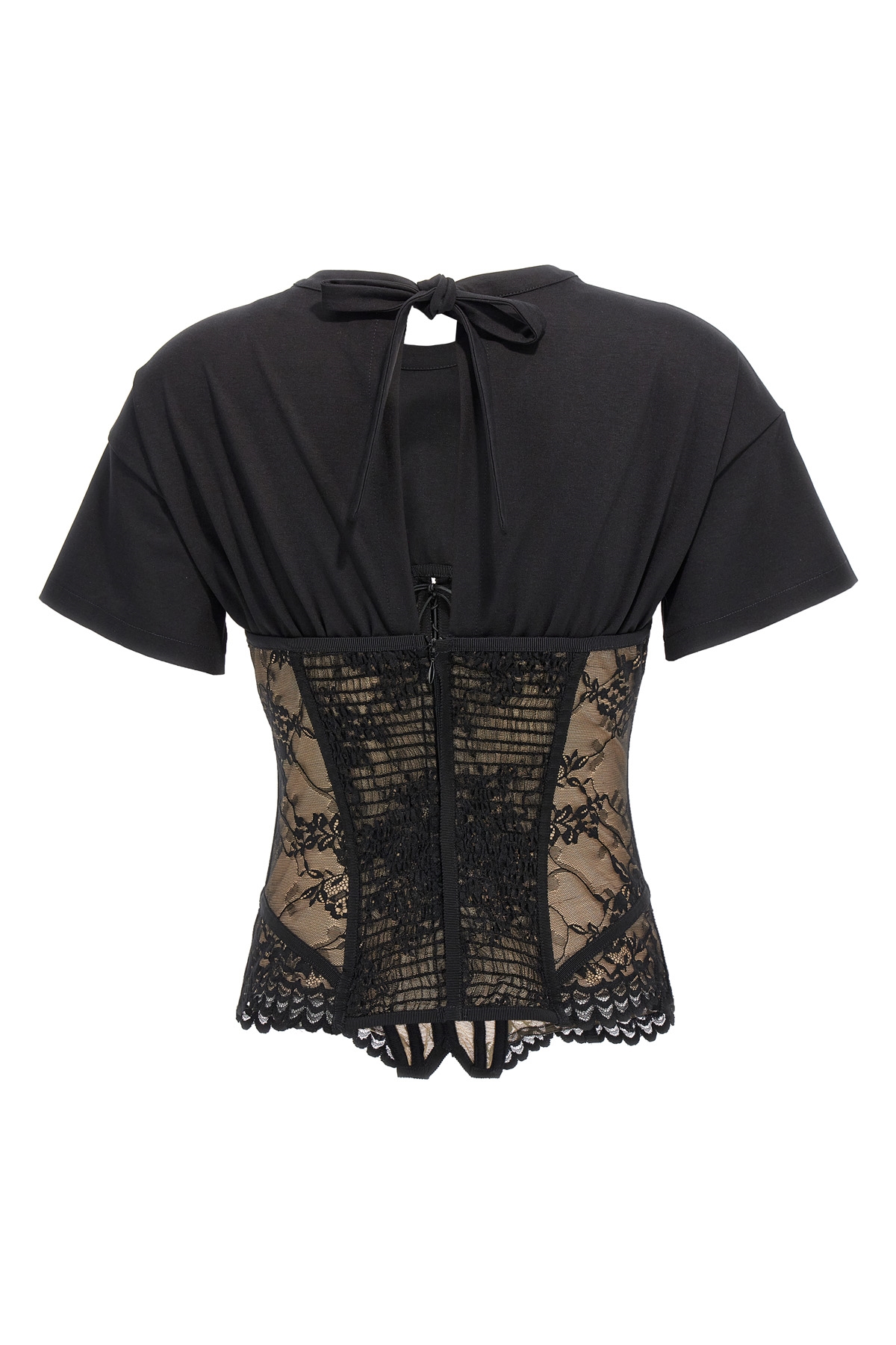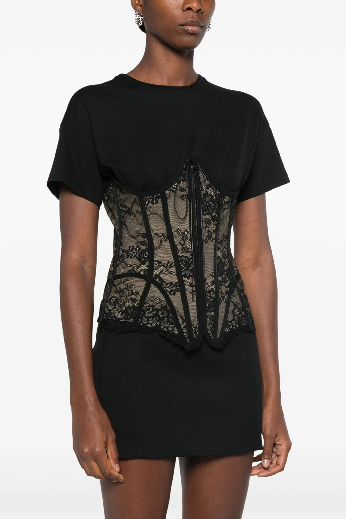 Stretch cotton blend top with lace bodice insert with cues and laces, crew neck, short sleeves, zip closure and back ribbon.