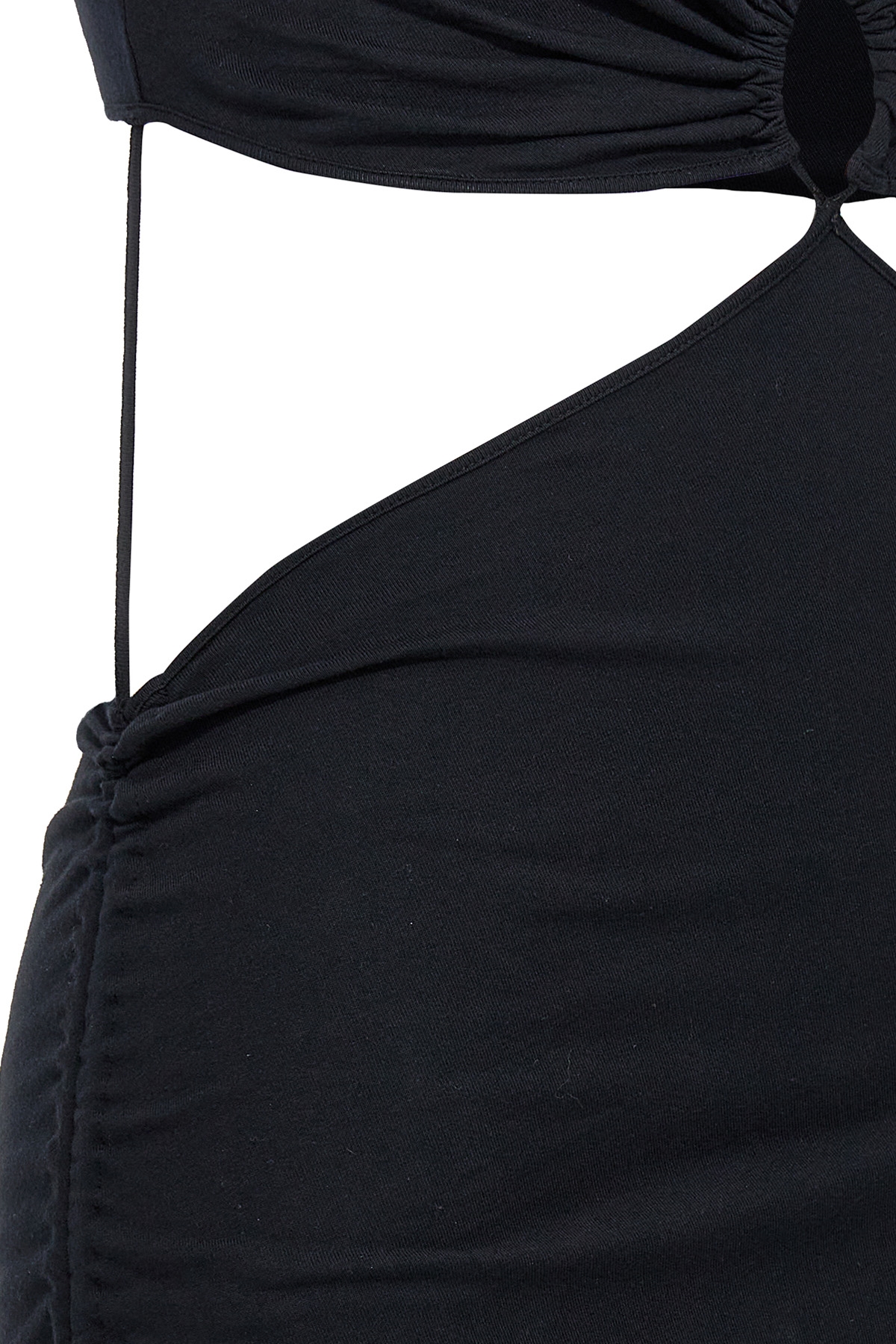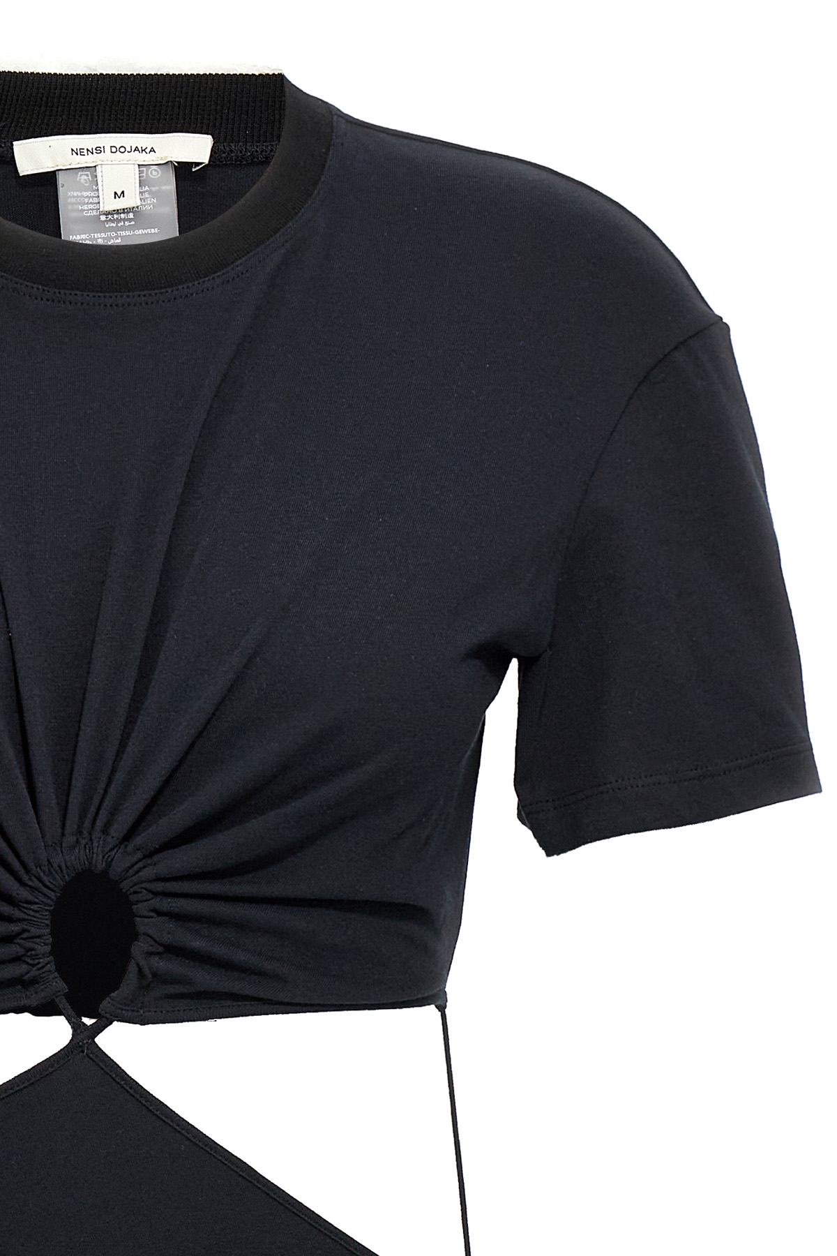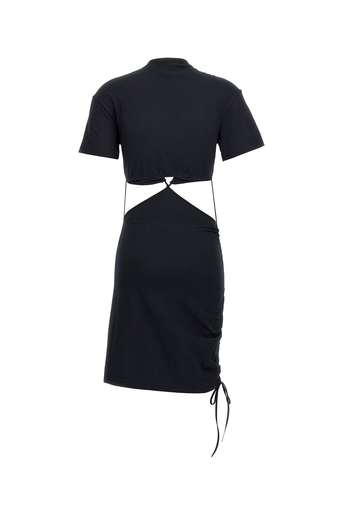 Cotton t-shirt dress with cut out details at the front and back, crewneck, short sleeves and a drawstring, gatherable on the side on the bottom hem.