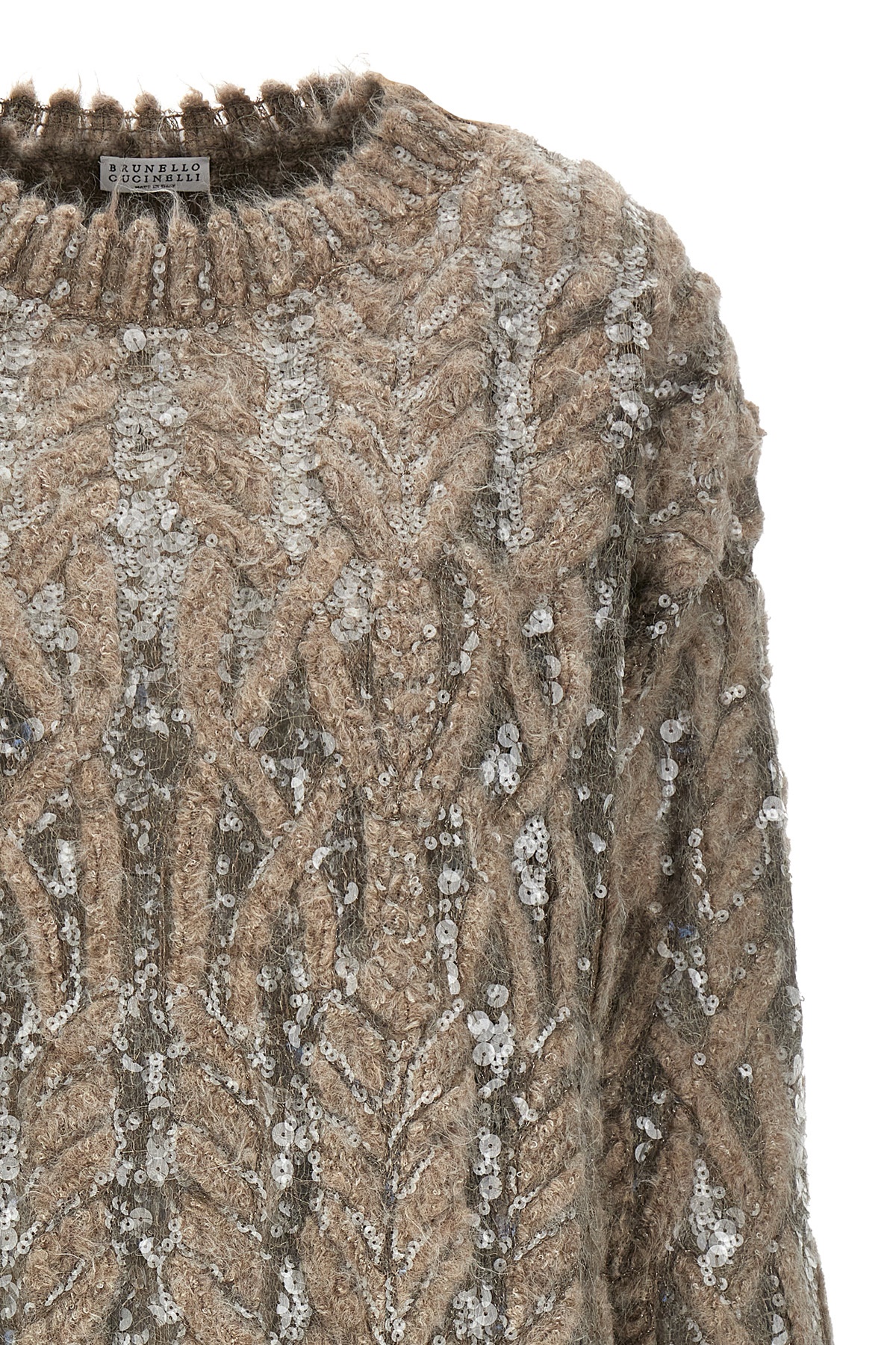 Alpaca blend sweater with all-over sequin applique, crew neck, and long sleeves.