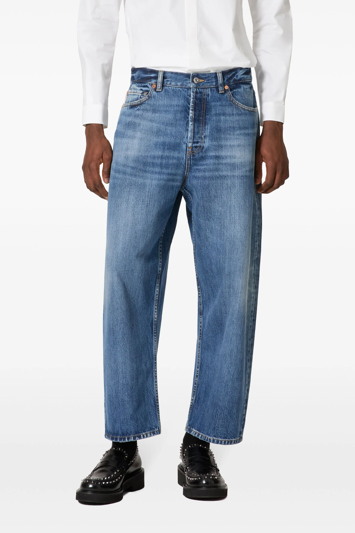 Cotton denim jeans with button closure, five pockets, leather logo tag.