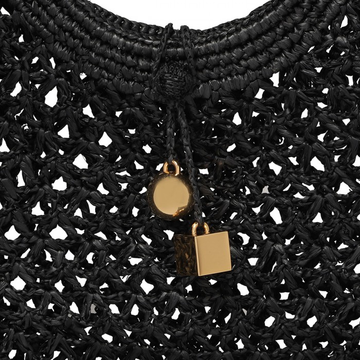 Black woven-raffia The Spiaggia round basket bag from Jacquemus featuring knot closure, reinforced braided edges, gold metal Rond-Carre charms.